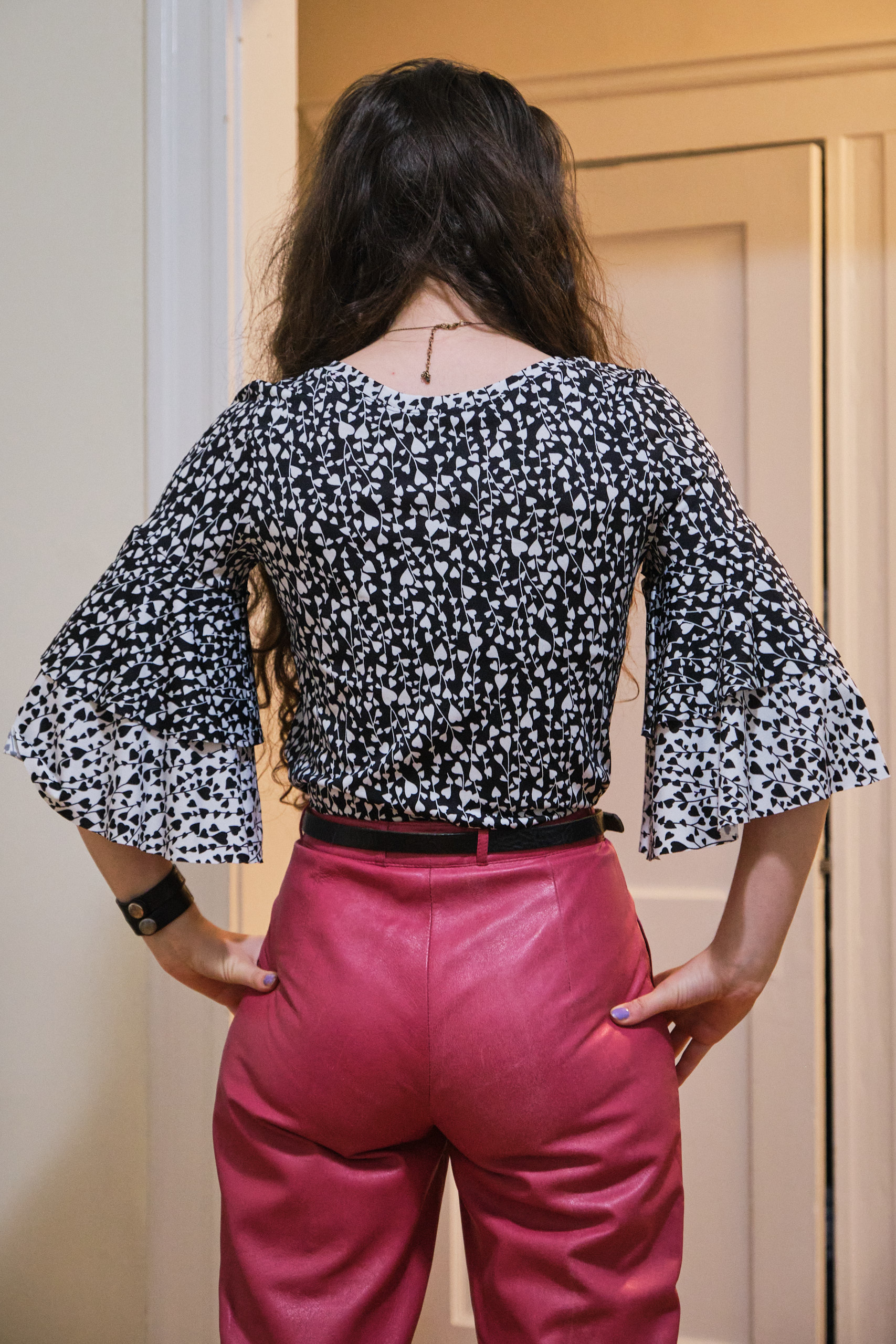 I had some fabric leftover black and white ITY fabric from my double-faux wrap dress and decided to use it to make a double-bell sleeve top for my daughter for her birthday last month. I used the Pattern Emporium Allure Bell Sleeve Top pattern, a pattern I had previously used only to add bell sleeves to the Wanderlust dress. Allure comes with a wide range of sleeve options. I decided to use the modern bell style in short and long lengths and attach them to short sleeves. I cut size AU 10 with a wide scoop neck. The pattern falls at hip length, so for me I would make it 2-3 inches shorter to account for my short height. My daughter prefers shorter tops and she is only an inch taller than me, so I shortened it by 5 inches.