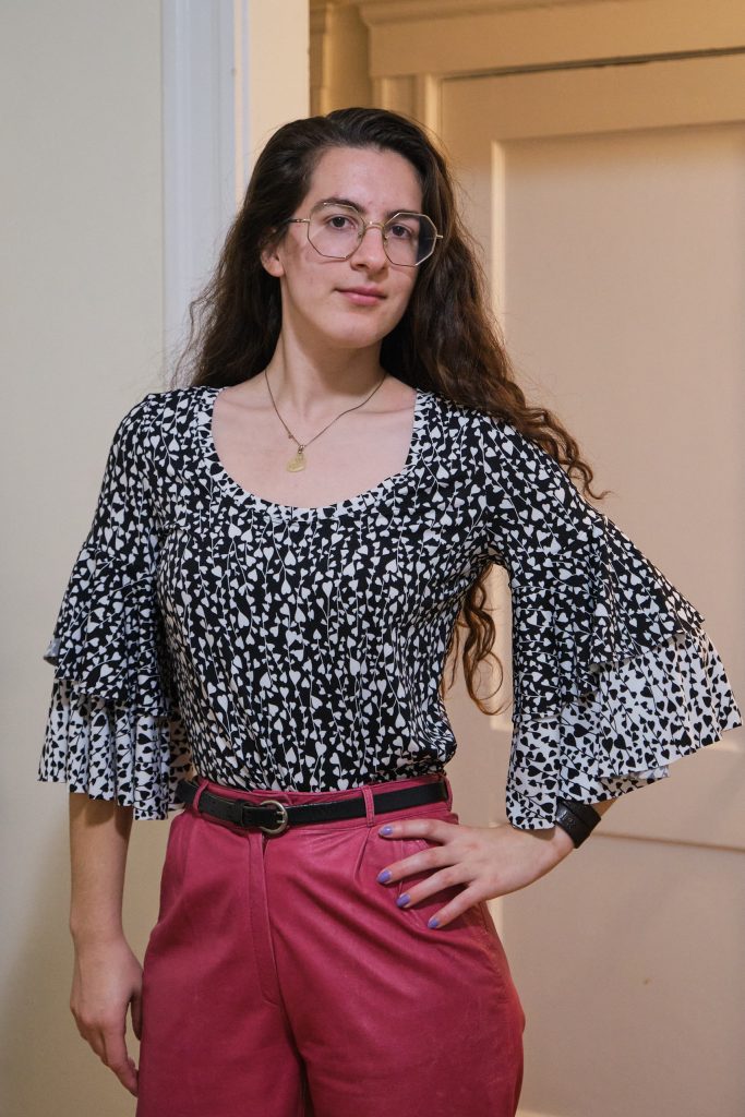 I like the sized-down fit, and didn’t have any problem getting it on or off. The flared sleeves aren’t as dramatic as the Be Mine balloon sleeves, but they still have plenty of drama, and they are easier to wear under a sweater. The top works both tucked and untucked.