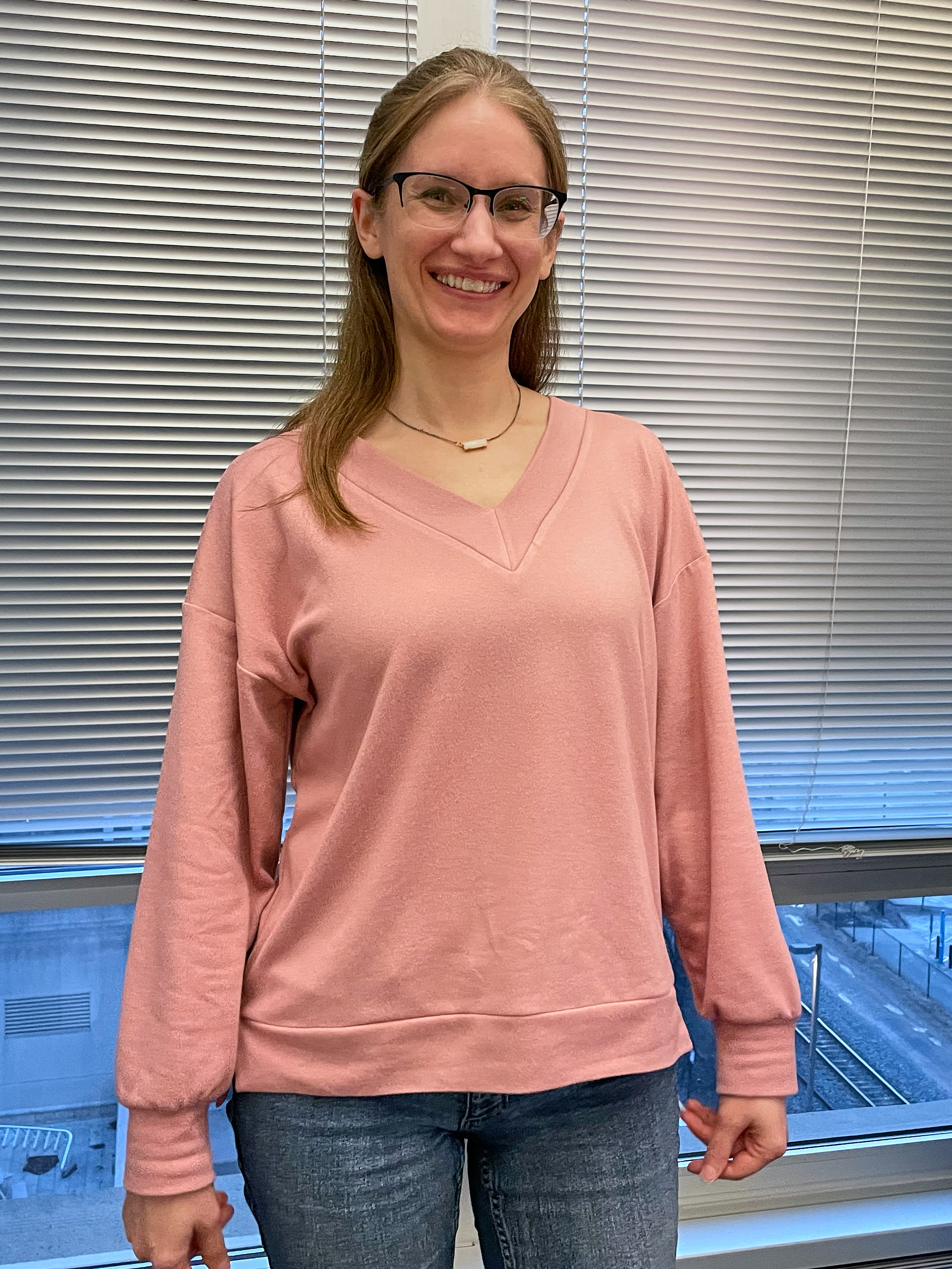 Pattern Emporium Sweet Cheeks Roomy Sweater AU 8, hip length, v-neck in 1.5 yards of rosey mauve Versailles brushed hacci sweater knit.