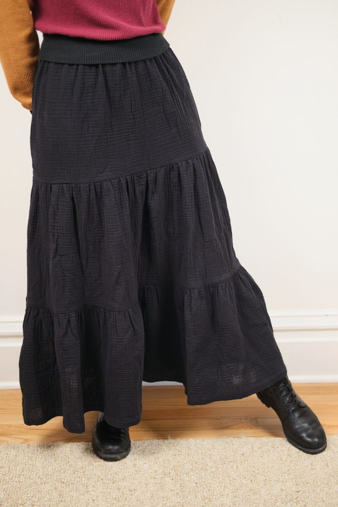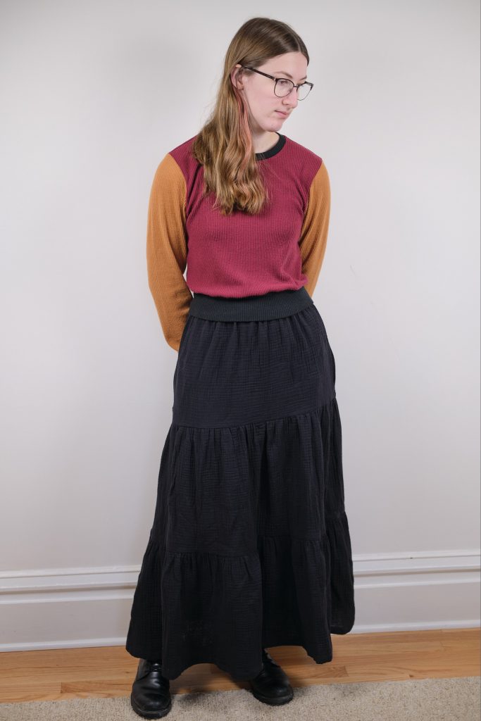 My daughter who now won’t wear any pants I didn’t sew for her, bought herself a cheap woven-polyester, black, tiered maxi skirt on Amazon. It didn’t take long before she inquired whether I could make something like it for her, but not so cheap looking. I asked her to measure the length and circumference of the cheap skirt and take a look at the black fabrics in my stash. She thought the black cotton double gauze would work, which is great because I still have a lot of double gauze I purchased when it was on clearance two years ago.