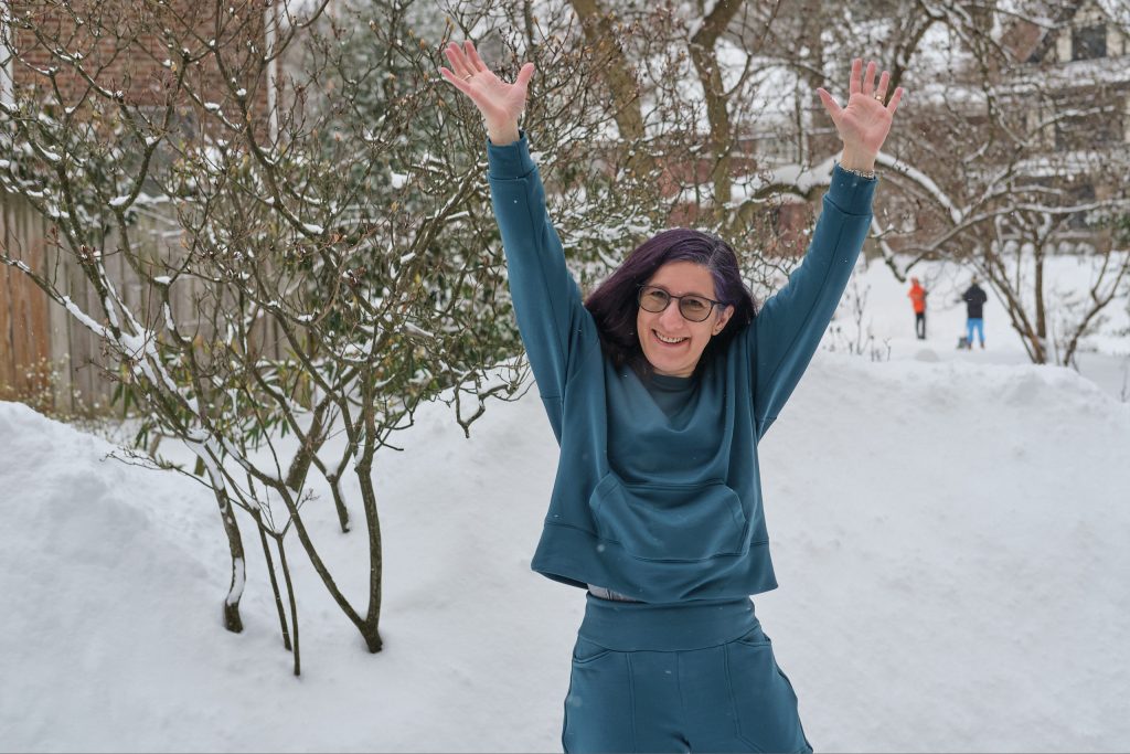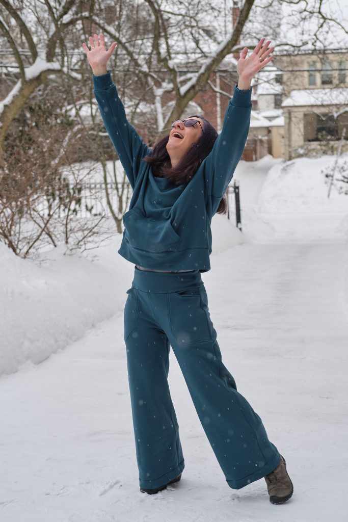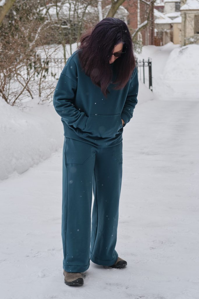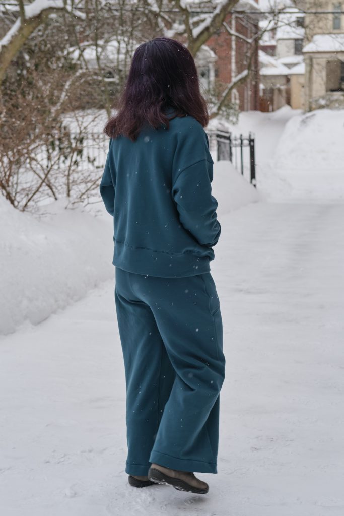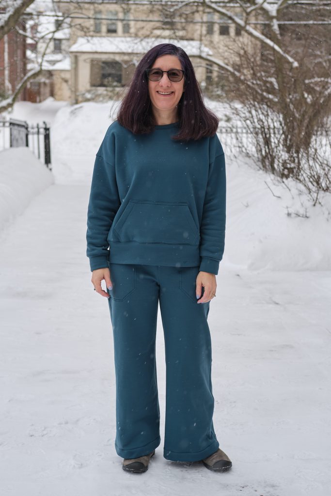 I’m very pleased with how the top came out, and I love how the complete lounge set works together. It is super comfy and cozy, and I even went outside in the snow for a photo shoot (we got over a foot of snow the day before). I will probably make more Biancas. It’s a great drop shoulder top that looks and feels roomy, but not enormous. For less bulky fabric I might go down to size D (but might keep the size E kangaroo pocket). It has options for a hood, side pockets, and for sewing with and without bands. Most commercial sweatshirts with kangaroo pockets also have hoods and I love the fact that when I sew my own clothes I can make it the way I want it with a kangaroo pocket and no hood.