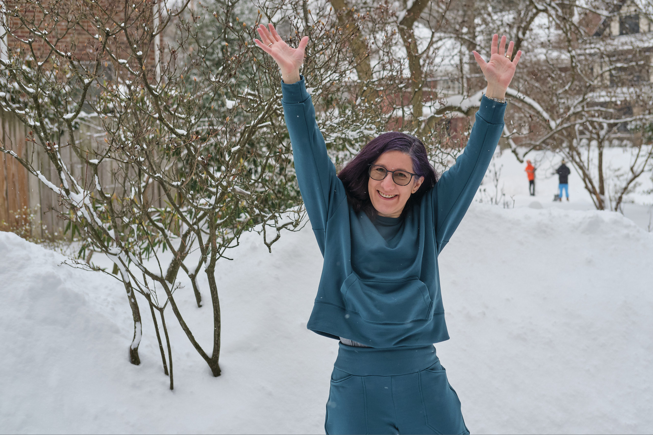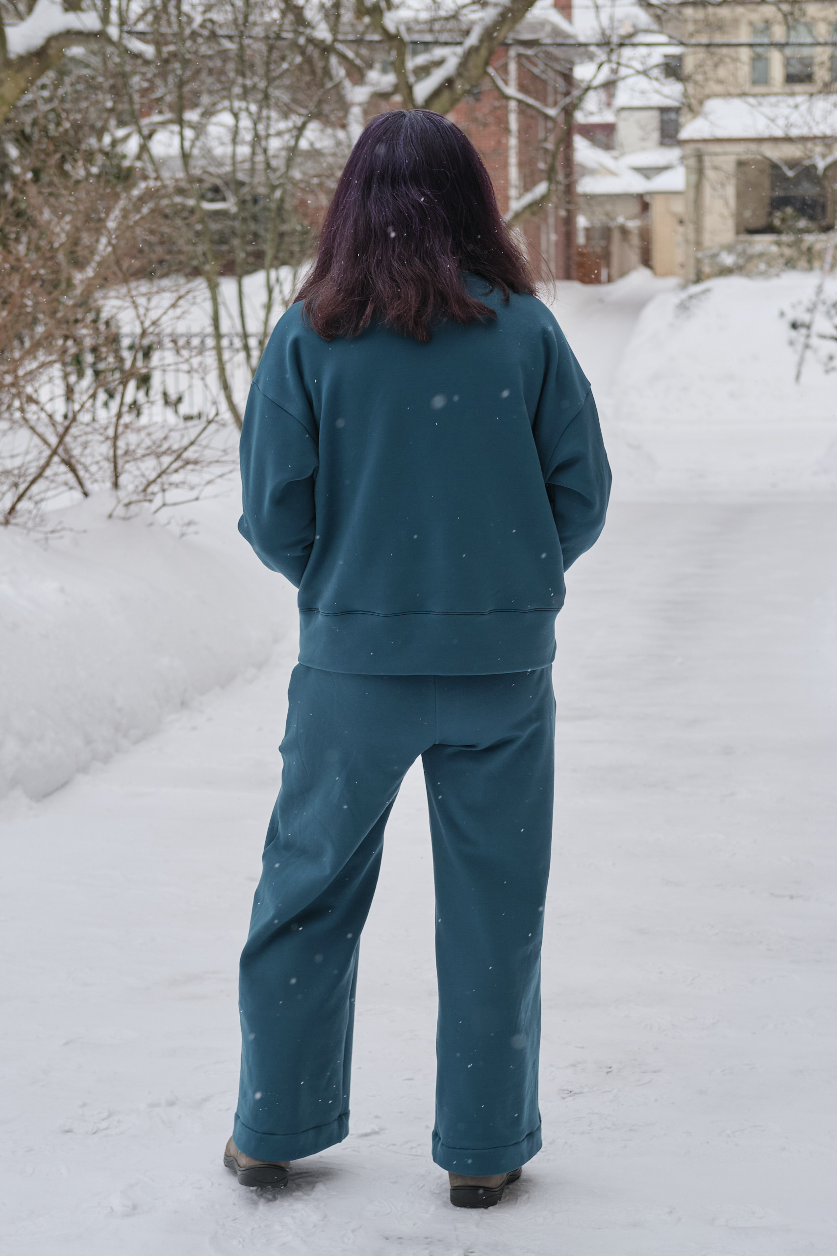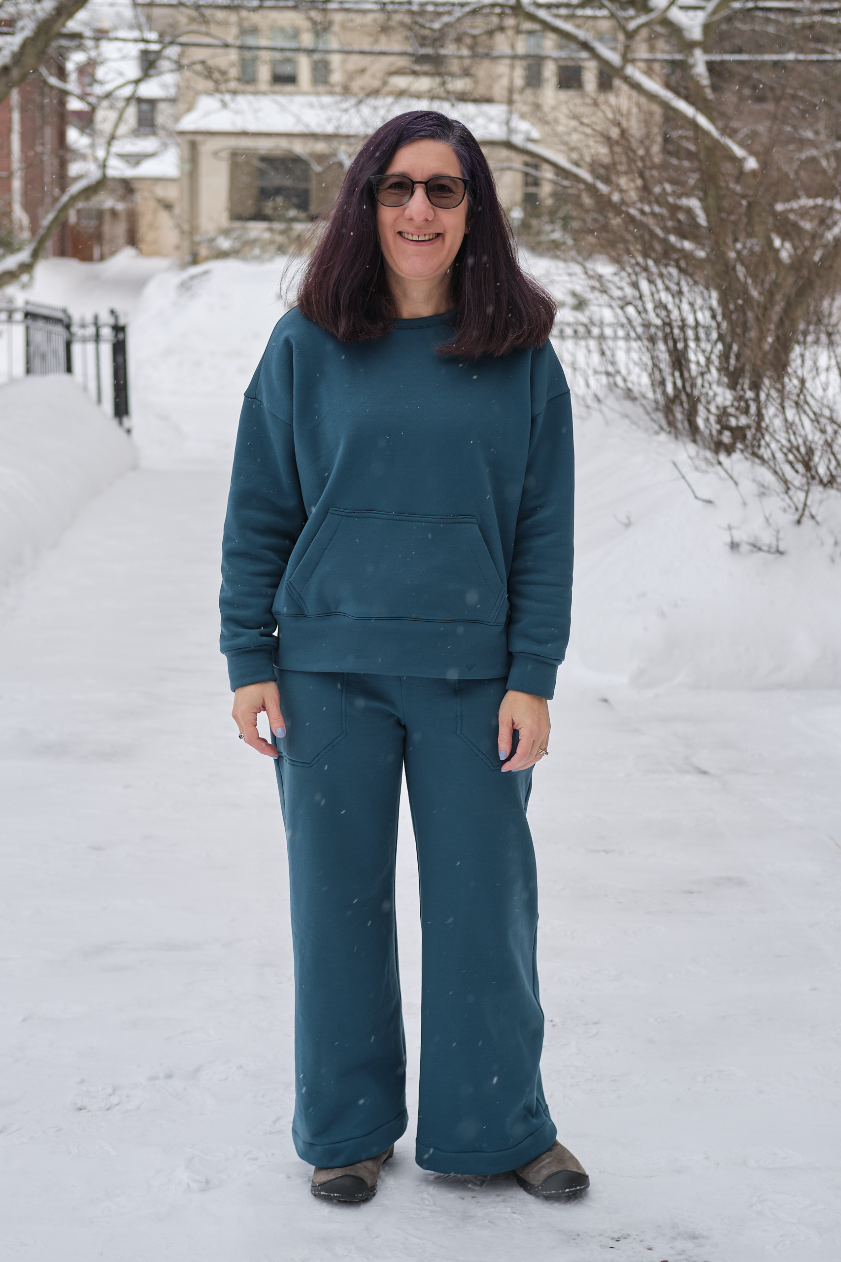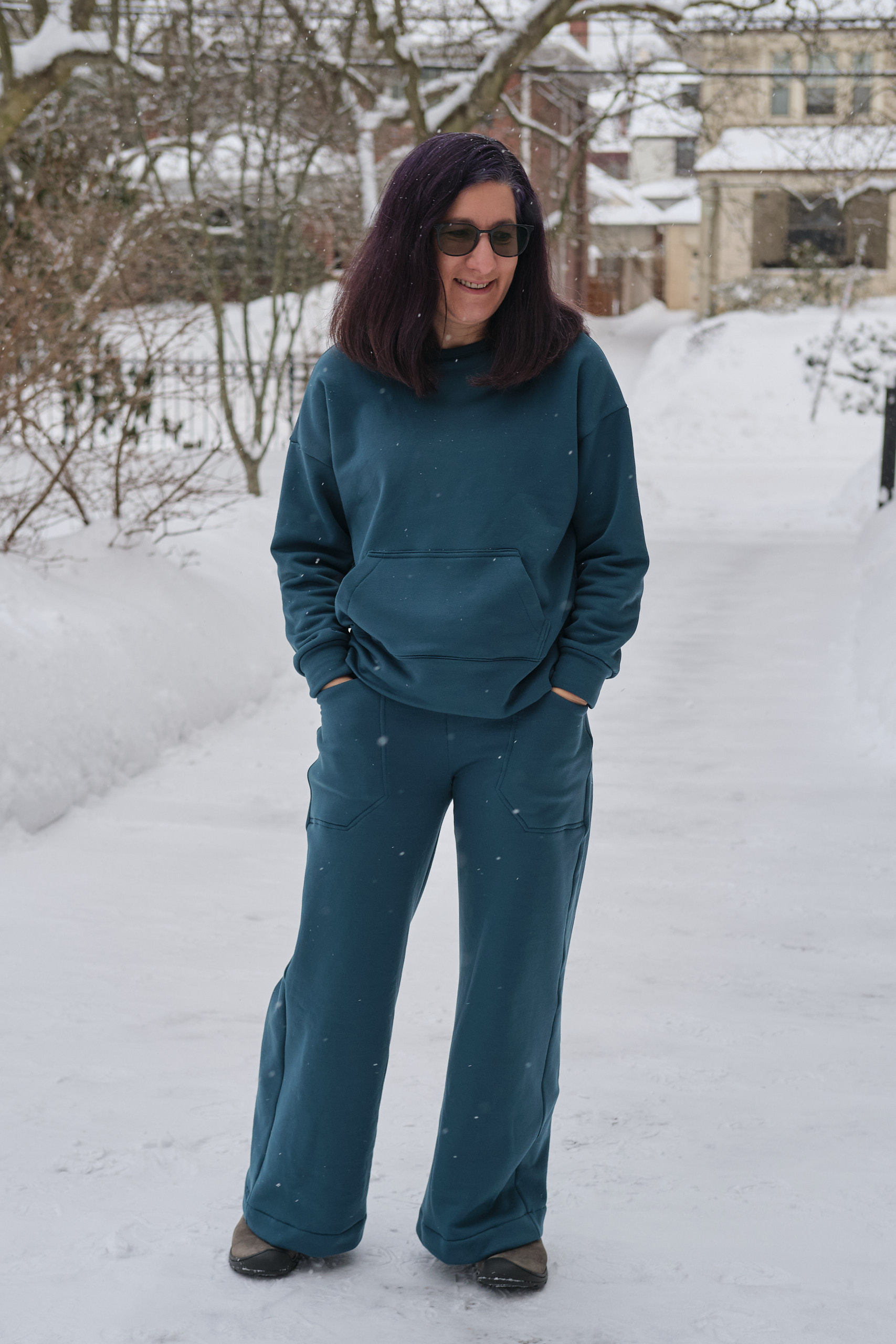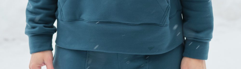 I’m very pleased with how the top came out, and I love how the complete lounge set works together. It is super comfy and cozy, and I even went outside in the snow for a photo shoot (we got over a foot of snow the day before). I will probably make more Biancas. It’s a great drop shoulder top that looks and feels roomy, but not enormous. For less bulky fabric I might go down to size D (but might keep the size E kangaroo pocket). It has options for a hood, side pockets, and for sewing with and without bands. Most commercial sweatshirts with kangaroo pockets also have hoods and I love the fact that when I sew my own clothes I can make it the way I want it with a kangaroo pocket and no hood.