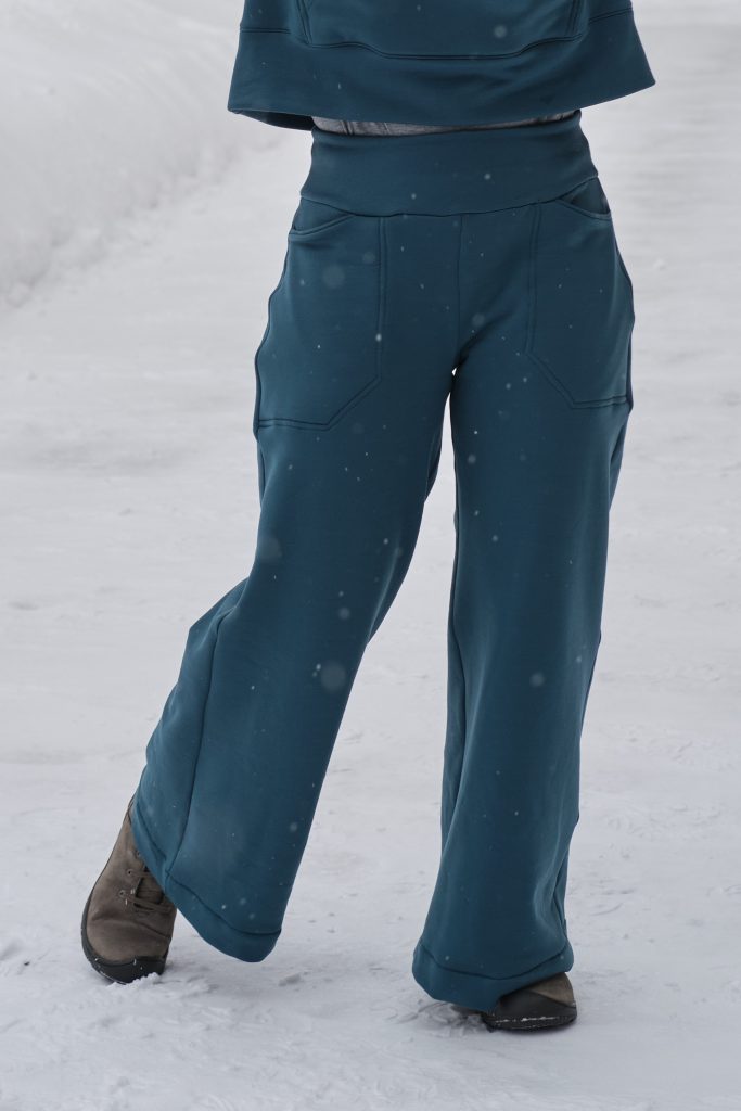 Pattern Emporium Urban wideleg pants size AU 10, low rise, graded in at waist, modified contour waistband with sewn-in elastic, shortened by 1.5 inches, jeans pockets top-stitched down, 1.5 yard spruce Polartec stretch sweatshirt fleece