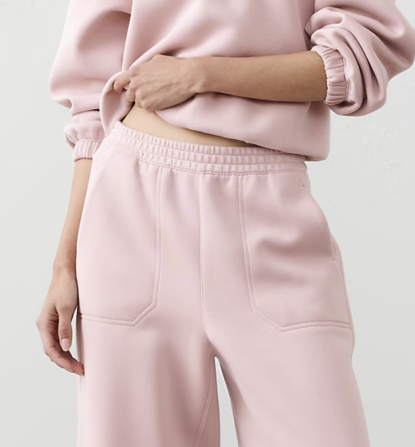 Pattern Emporium Urban wideleg pants size AU 10, low rise, graded in at waist, modified contour waistband with sewn-in elastic, shortened by 1.5 inches, jeans pockets top-stitched down, 1.5 yard spruce Polartec stretch sweatshirt fleece