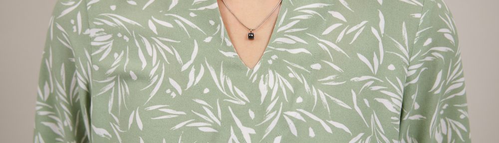 I used a light sage polyester woven “cey” fabric called Tess Cey from Mily Mae Fabrics. I bought it when it was on sale for $3.75/yard. (Apparently, CEY is an acronym for continuous environmental yarn and refers to a type of polyester fabric made with sustainable practices that tends to be soft, drapey, and wrinkle-resistant.) This fabric is a little slippery to work with. It is not a stretch fabric, but it does have a little bit of mechanical stretch. It doesn’t tend to wrinkle, but it does hold a crease when pressed with an iron. I used about 2 yards of fabric.