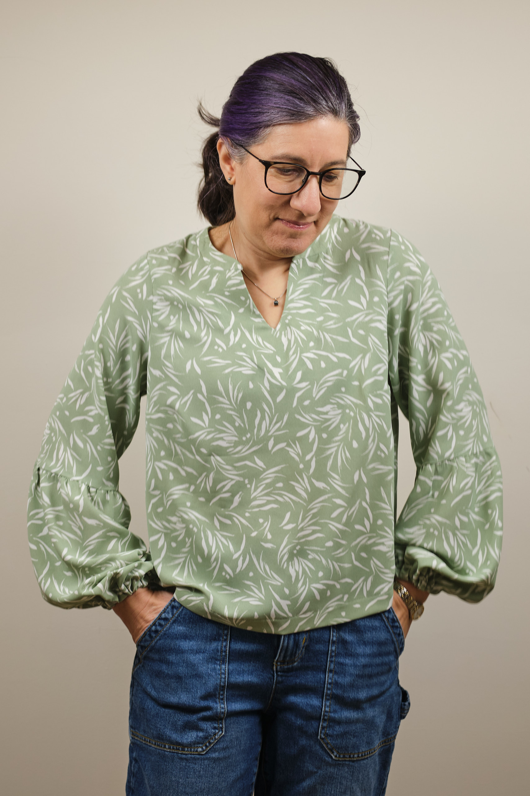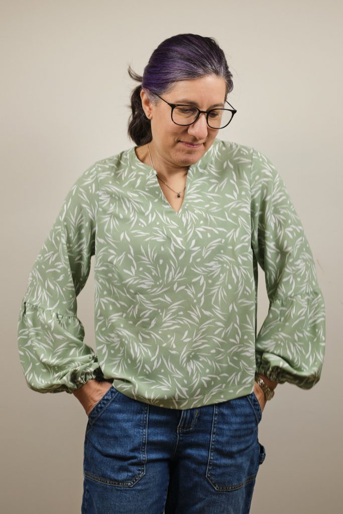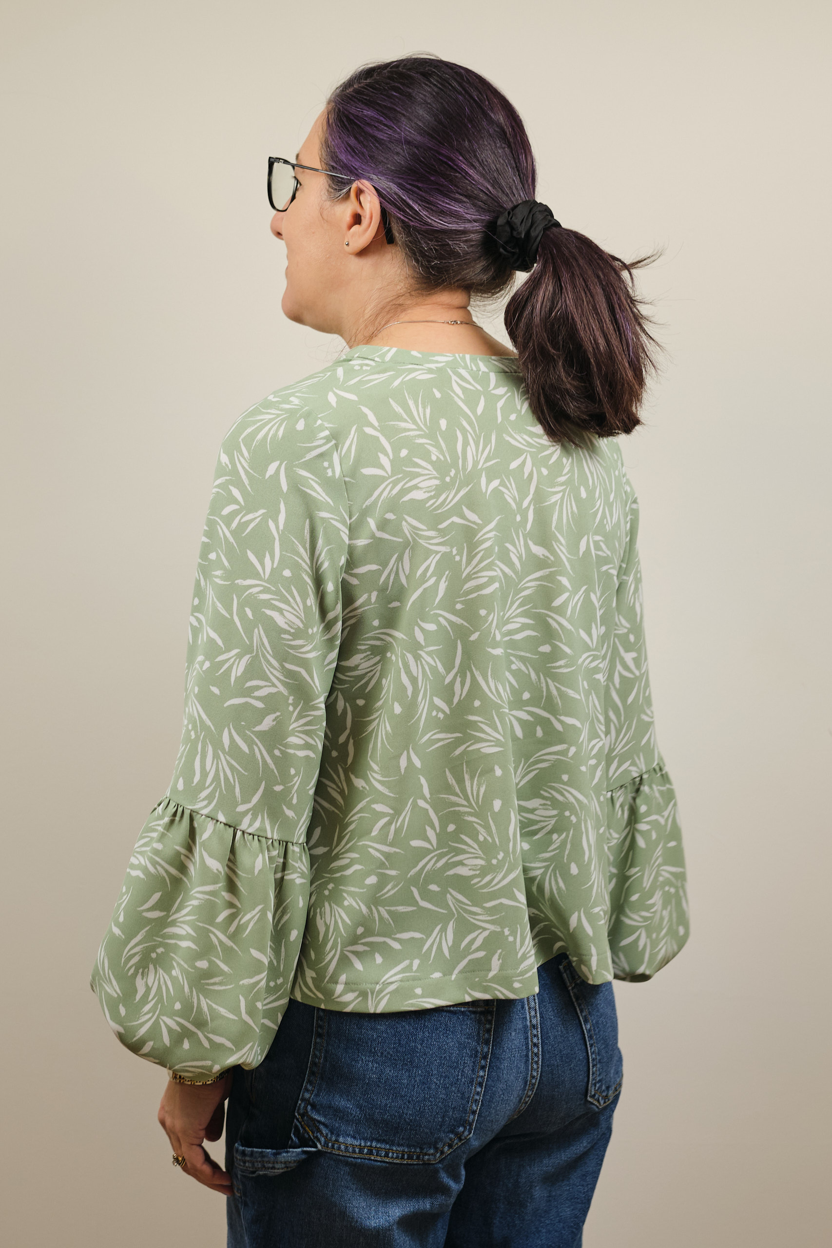 Love Notions Muse blouse, straight bodice, tiered sleeves, size small, shortened bodice and sleeves, from 2 yards or light sage Tess Cey.