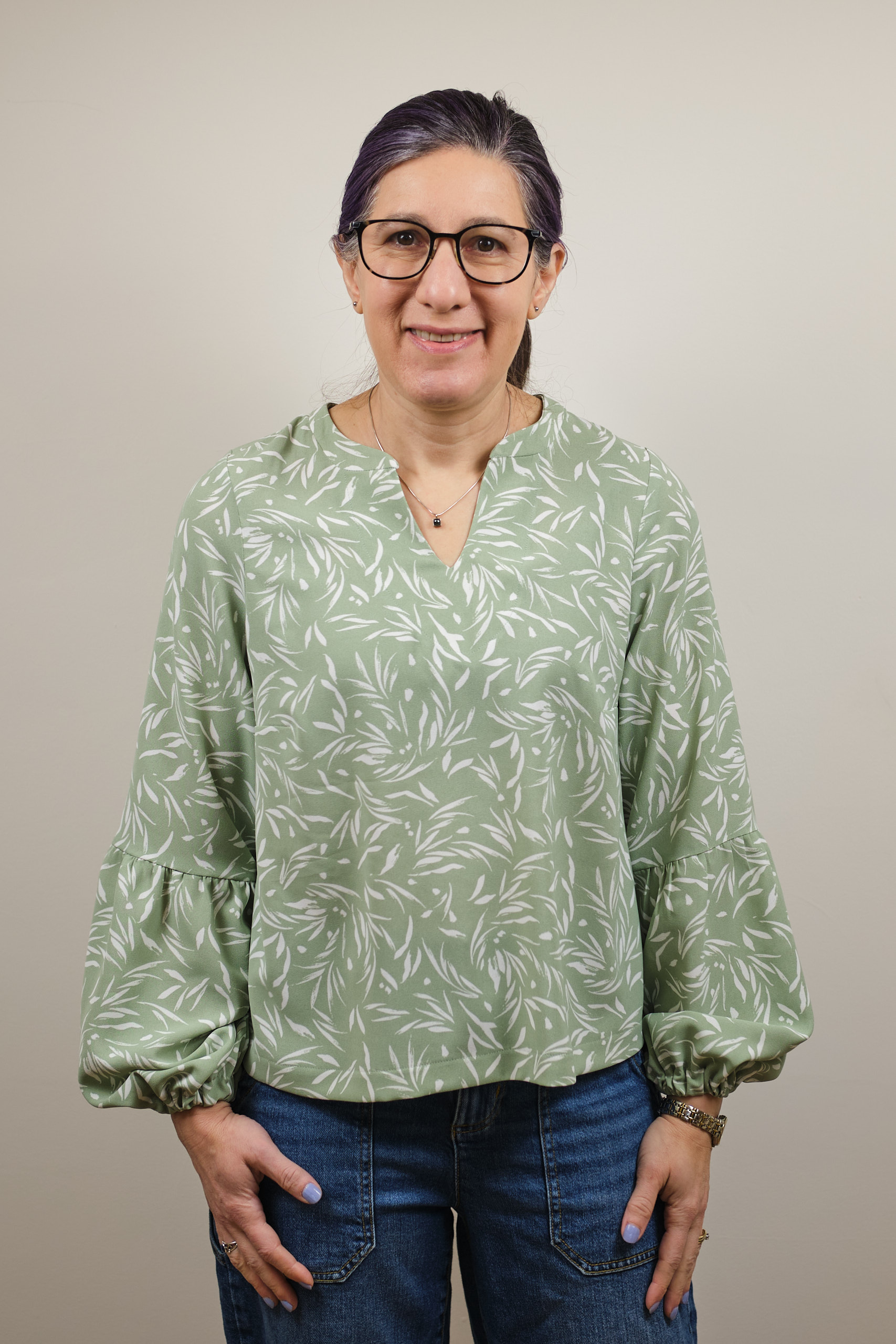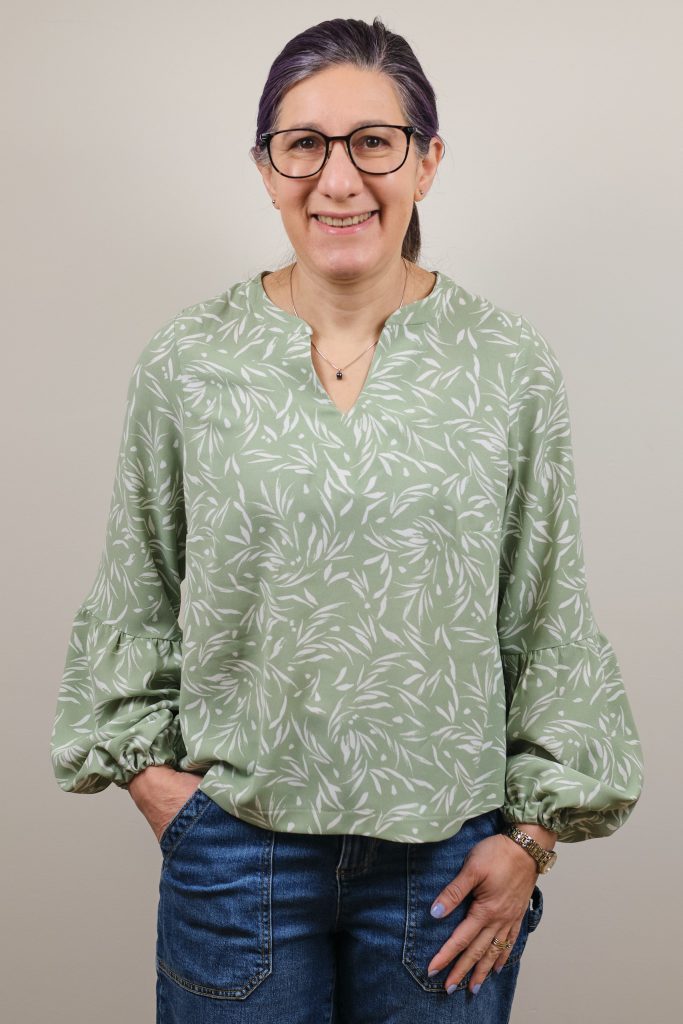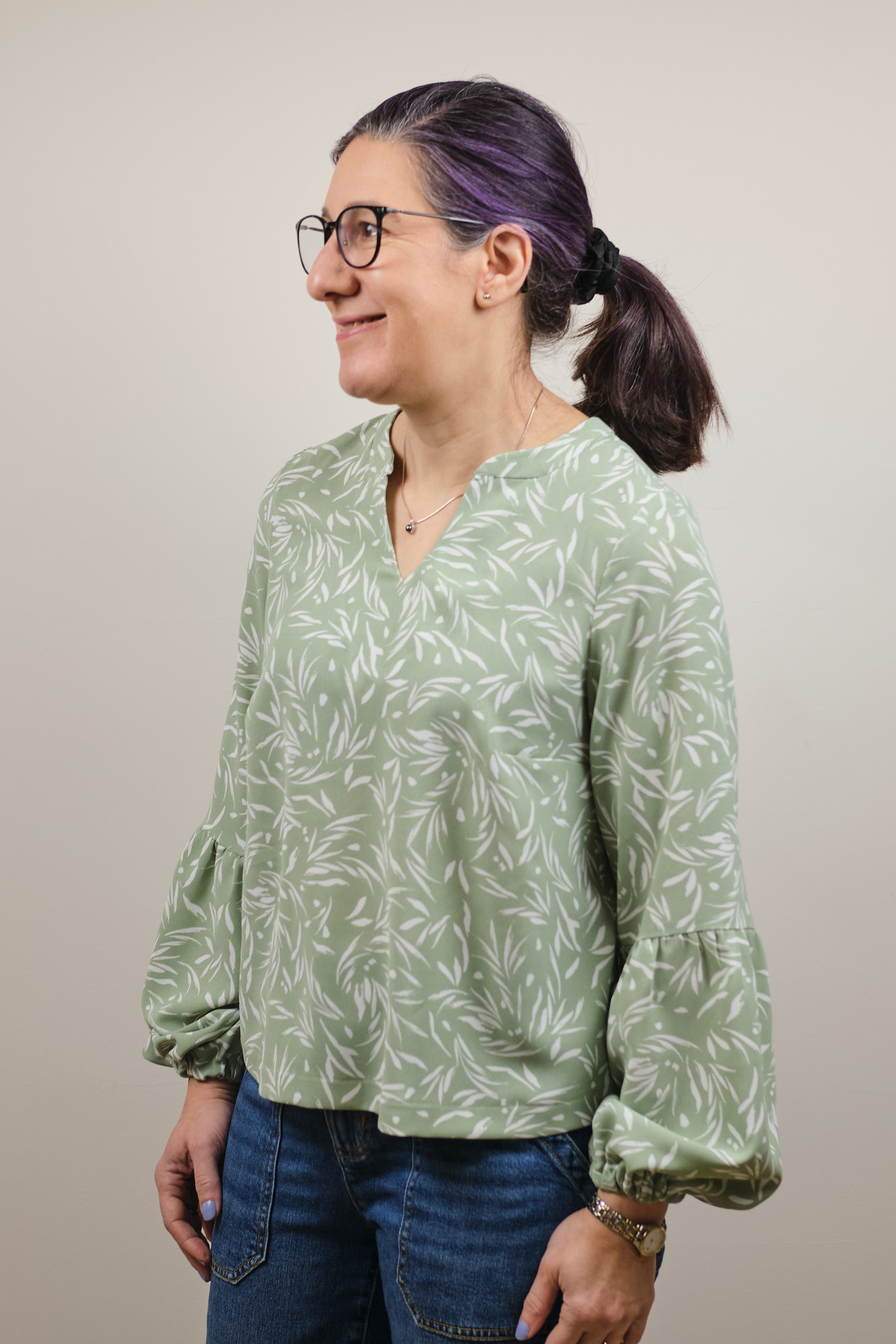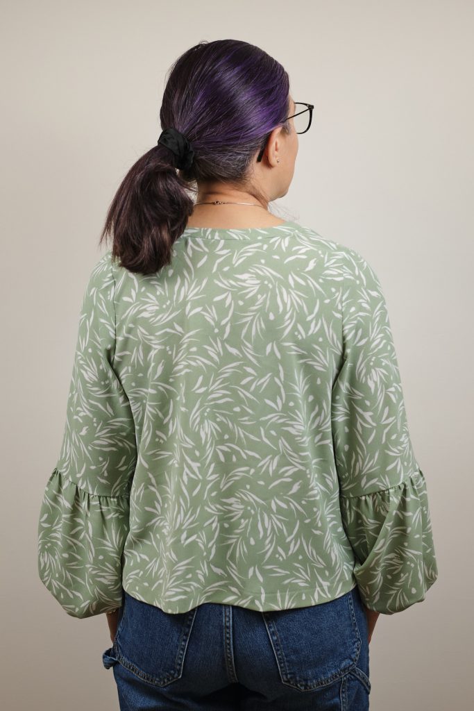 Love Notions Muse blouse, straight bodice, tiered sleeves, size small, shortened bodice and sleeves, from 2 yards or light sage Tess Cey.