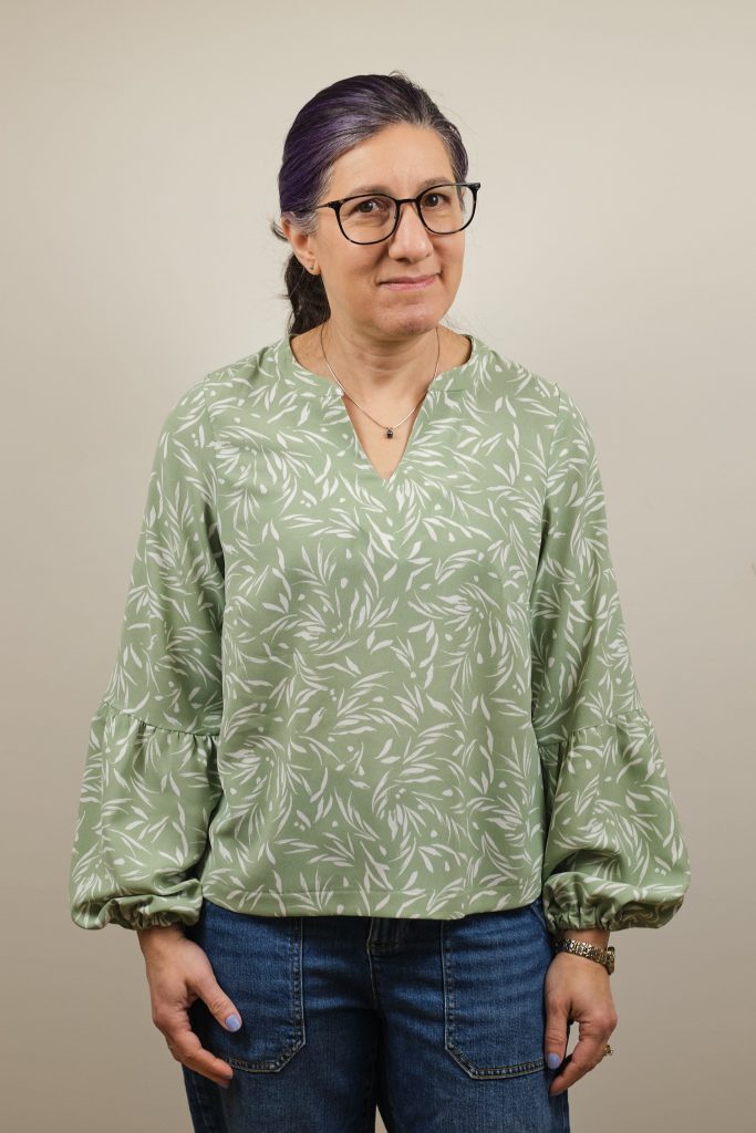 The new pattern is called “Muse” and it is a woven blouse pattern that can be made with regular short sleeves, balloon sleeves, or tiered sleeves. It can be sewn with a straight bodice or a skirted bodice, optionally with a balloon hem. It is cold and snowy in Pittsburgh, so I asked to sew the long-sleeve version. I’ve also not loved the look of most skirted woven tops on me, so I requested to sew the straight bodice. I was assigned to sew size small, according to my measurements.