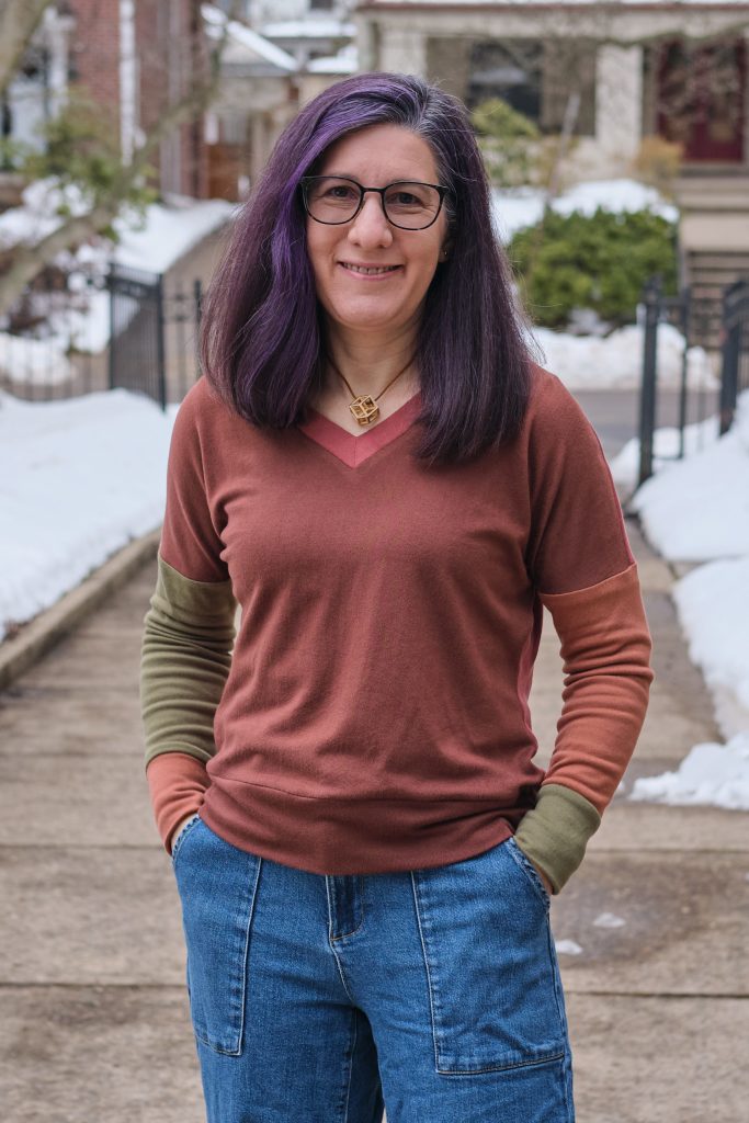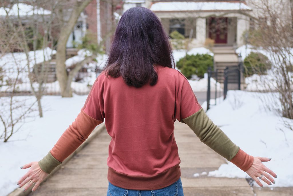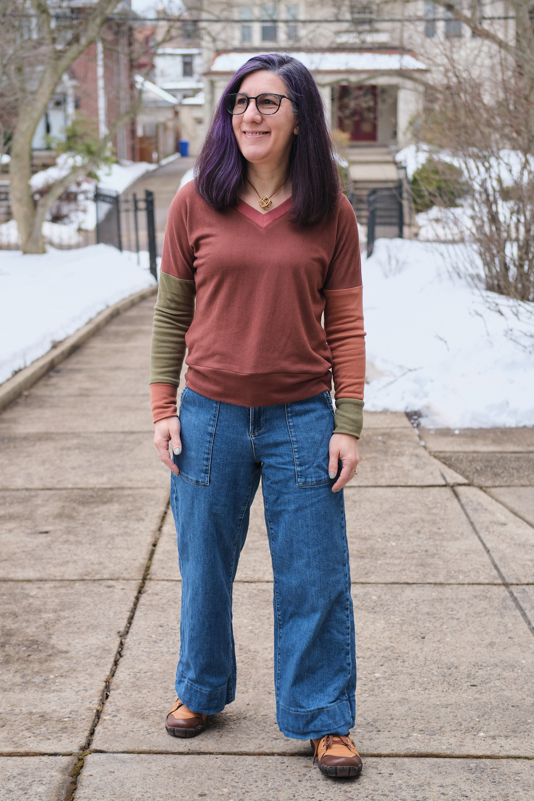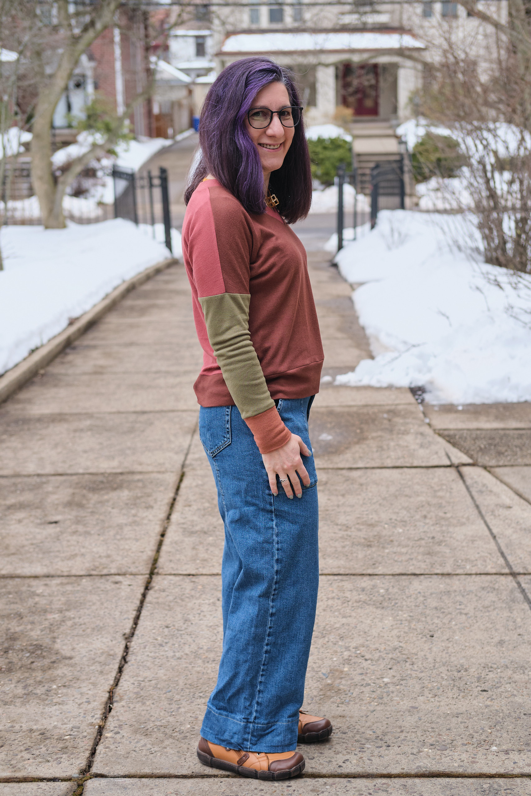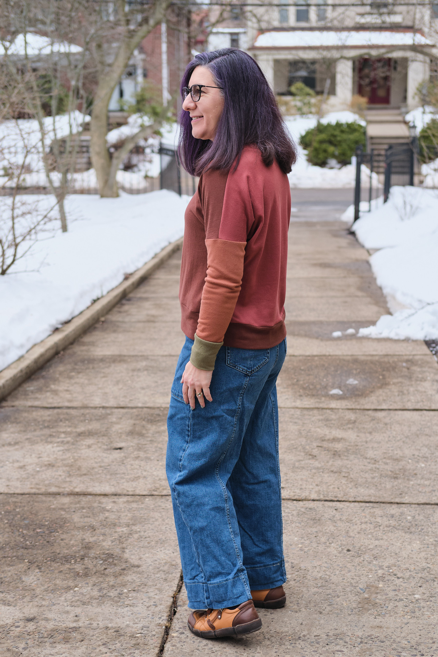 Earth tones are not my usual palette, and I don’t normally wear this much brown, but I really like this combo and it looks exactly like I imagined it would! I even had the perfect pair of shoes to match (these are the only brown shoes I own). I also really like the fit and drape of my cropped Soho, and it fits my shoulders without any adjustments. Note that in the photos here, I am wearing a long-sleeve t-shirt underneath because it is cold outside, so it clings just a bit to the undershirt, but you probably didn’t notice.
