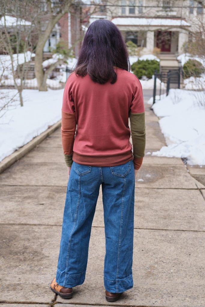 I thought about using the Sinclair Crew pullover pattern as I did for my family holiday sweater project, but the sweater in my vision was a dolman sleeve or drop shoulder design, not too oversized. After hacking the Sinclair Soho relaxed dolman sweater last week, I knew I could hack it into the color block sweater I imagined. For last week’s sweater I merged the sleeves and the bodice and added tall cuffs from the Crew pattern. This time I kept the sleeves but shifted three inches from the bodice to the sleeves so that the sleeves would begin above the elbow instead of below the elbow (which is how they sit in the first Soho sweater I made from a green rib sweater knit). I shortened the sleeves and added the Crew tall cuffs again. I also shortened the bodice by 6.5 inches before adding the band, same as I did last week.