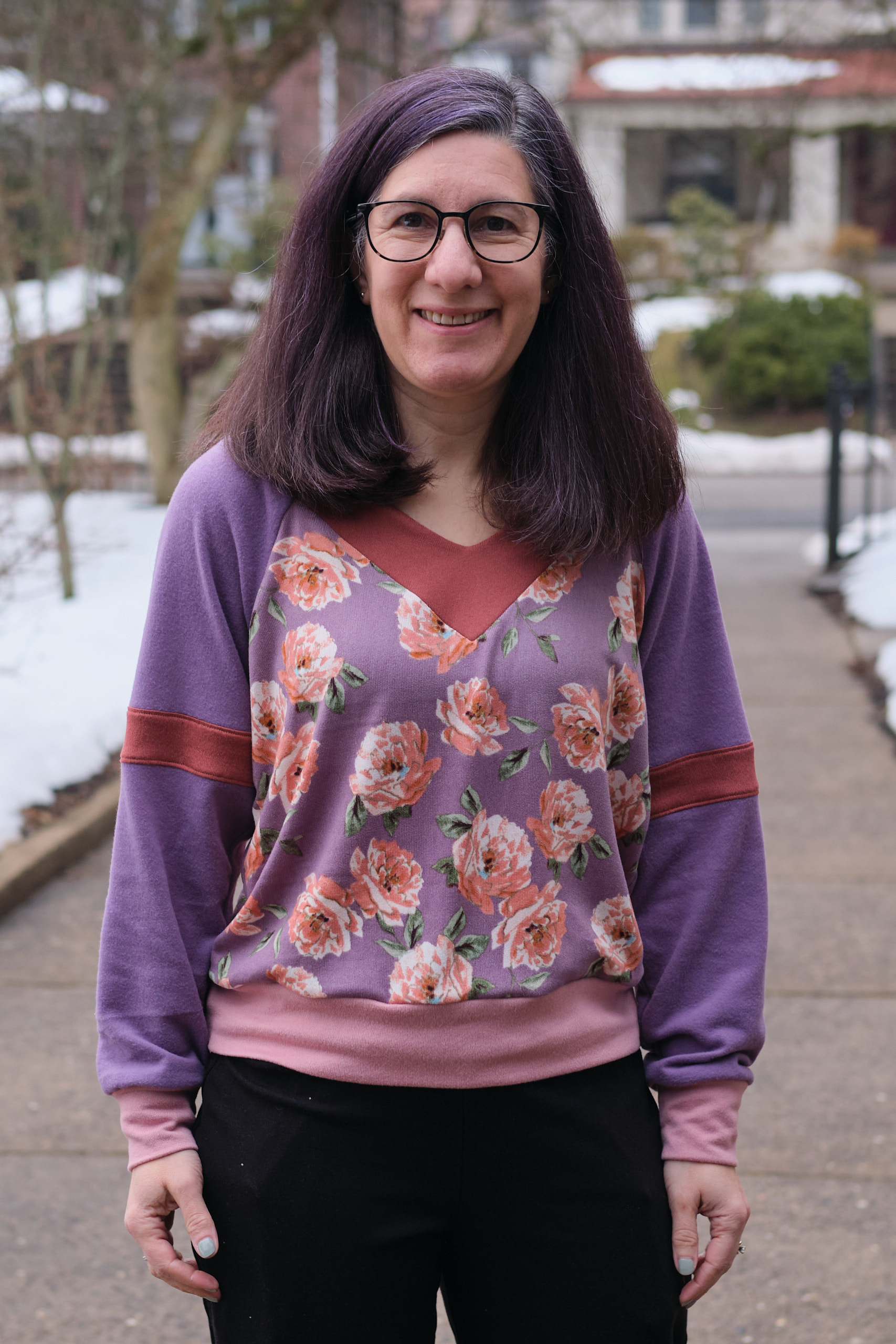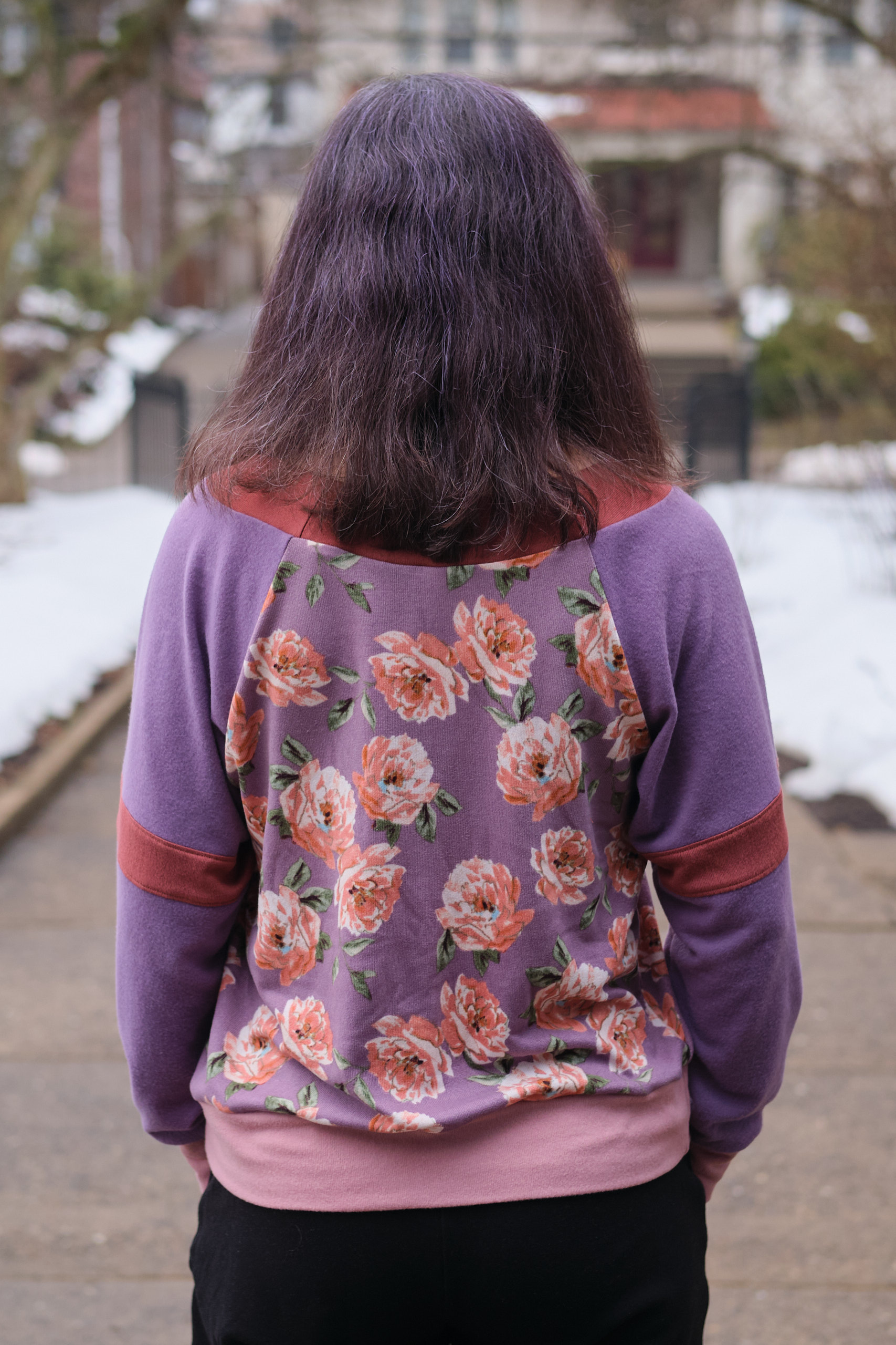 Hollis was a fun sew, and I would definitely consider making another to use up scraps. It is a loose, but not oversized fit, and I think it would work with a wide range of knit fabrics. I still might make a sweatshirt fleece version someday. In the mean time, I have a lot of the purple floral and solid purple hacci left over. Should I make matching pants?