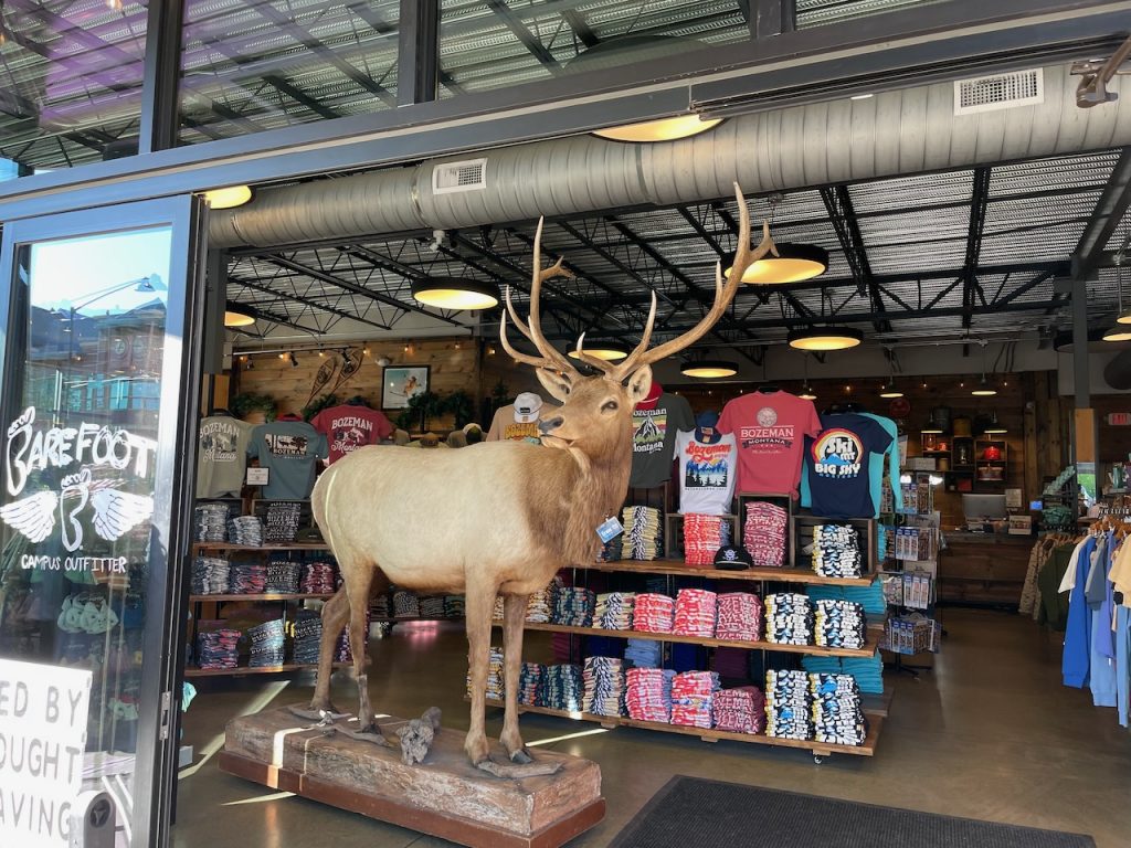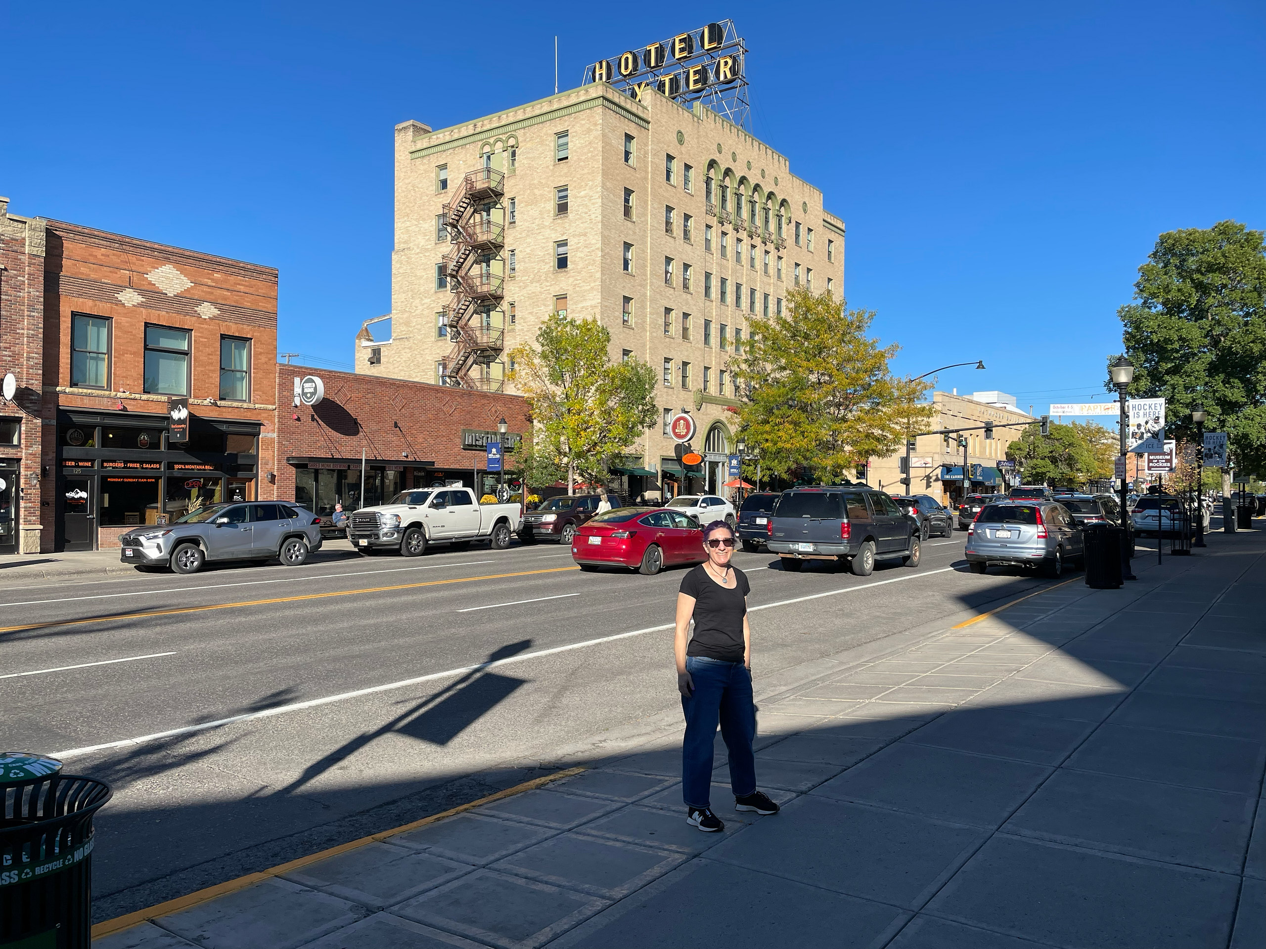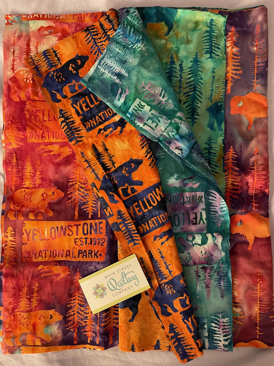 We spent some time exploring Main Street in Bozeman, which had a banner across the street advertising the awards ceremony. There were lots of bars, outdoor stores, tshirt shops, and some ice cream shops and nicer restaurants. While we were wandering around I checked Google maps for the nearest fabric store and discovered one about 300 feet from where we were standing — I hadn’t noticed it because there was scaffolding in front of it for some construction. So I declared a fabric emergency and we immediately headed to the fabric store. It was a good sized store with a lot of quilting fabric. I was impressed that they had commissioned their own Yellowstone batik fabrics in several color ways. So I had to buy some as a souvenir.