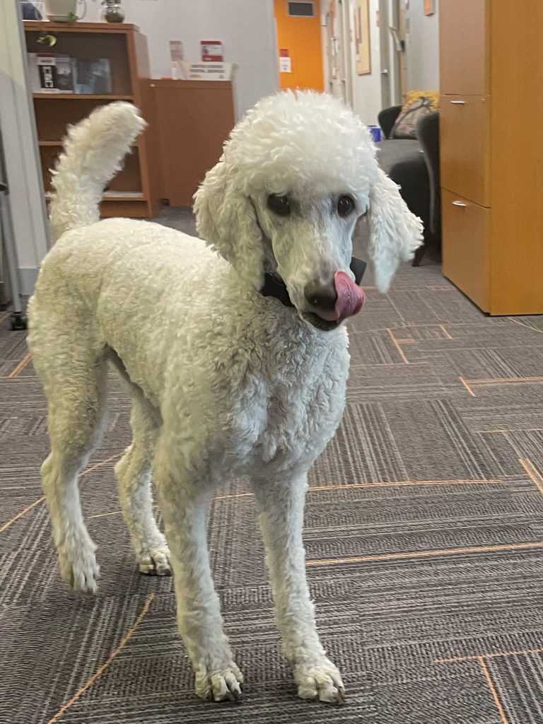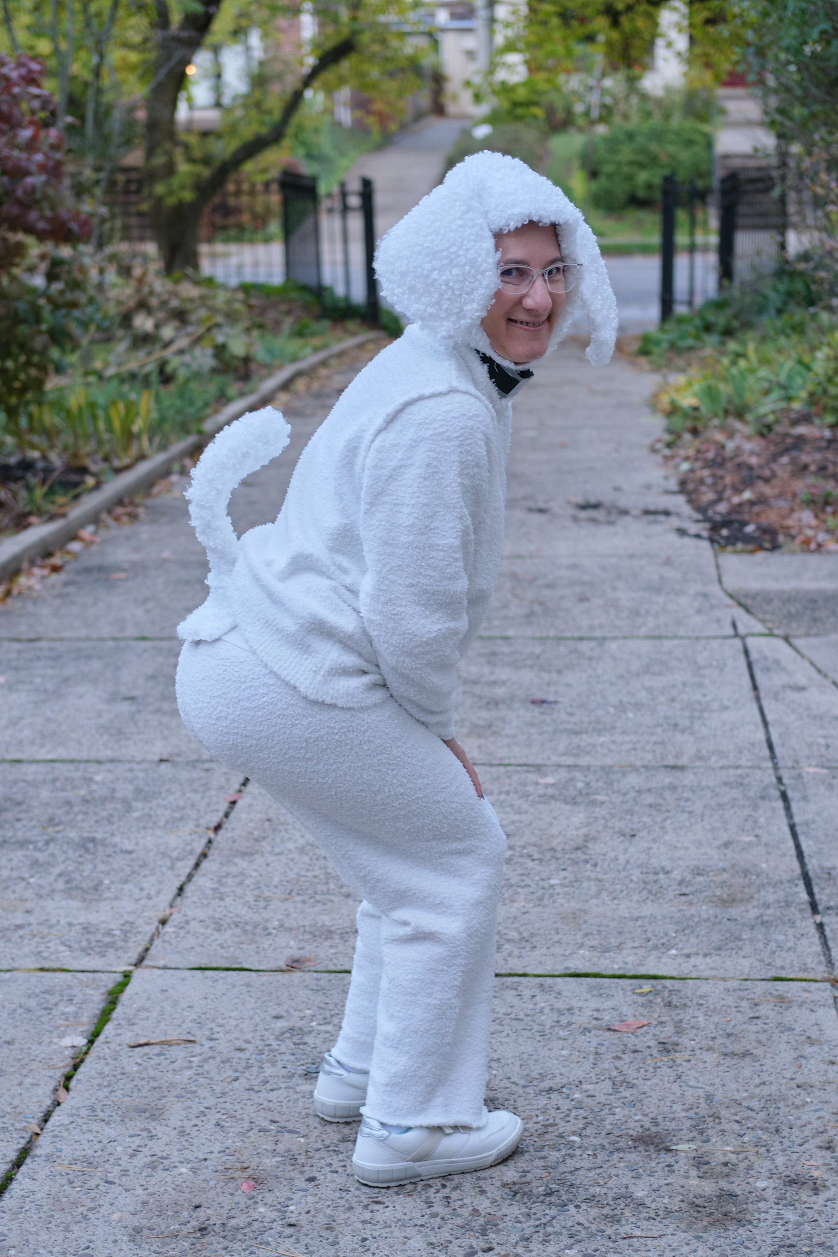 At a Halloween party at work last year I got the idea of dressing up as Belka, the white standard poodle who roams around our office. I have been mulling this over in my mind for a year (am I obsessed?) and now finally my vision is a reality.