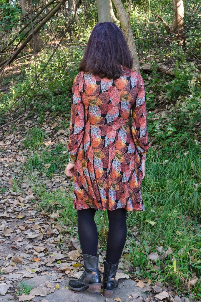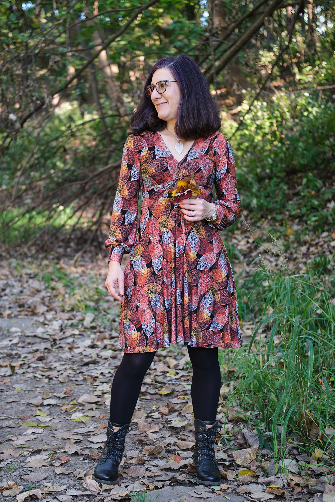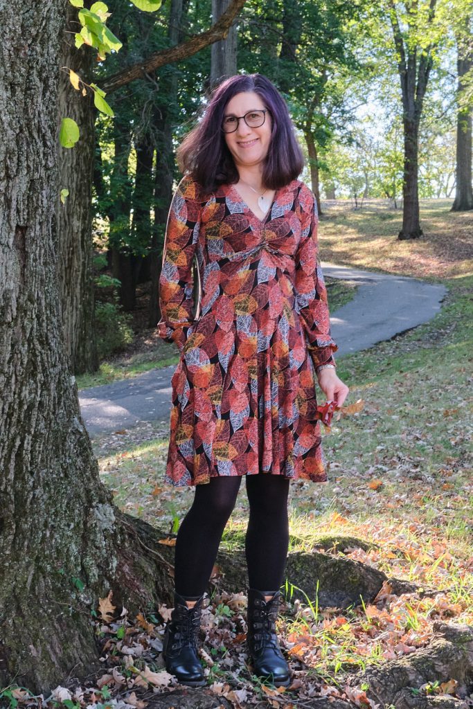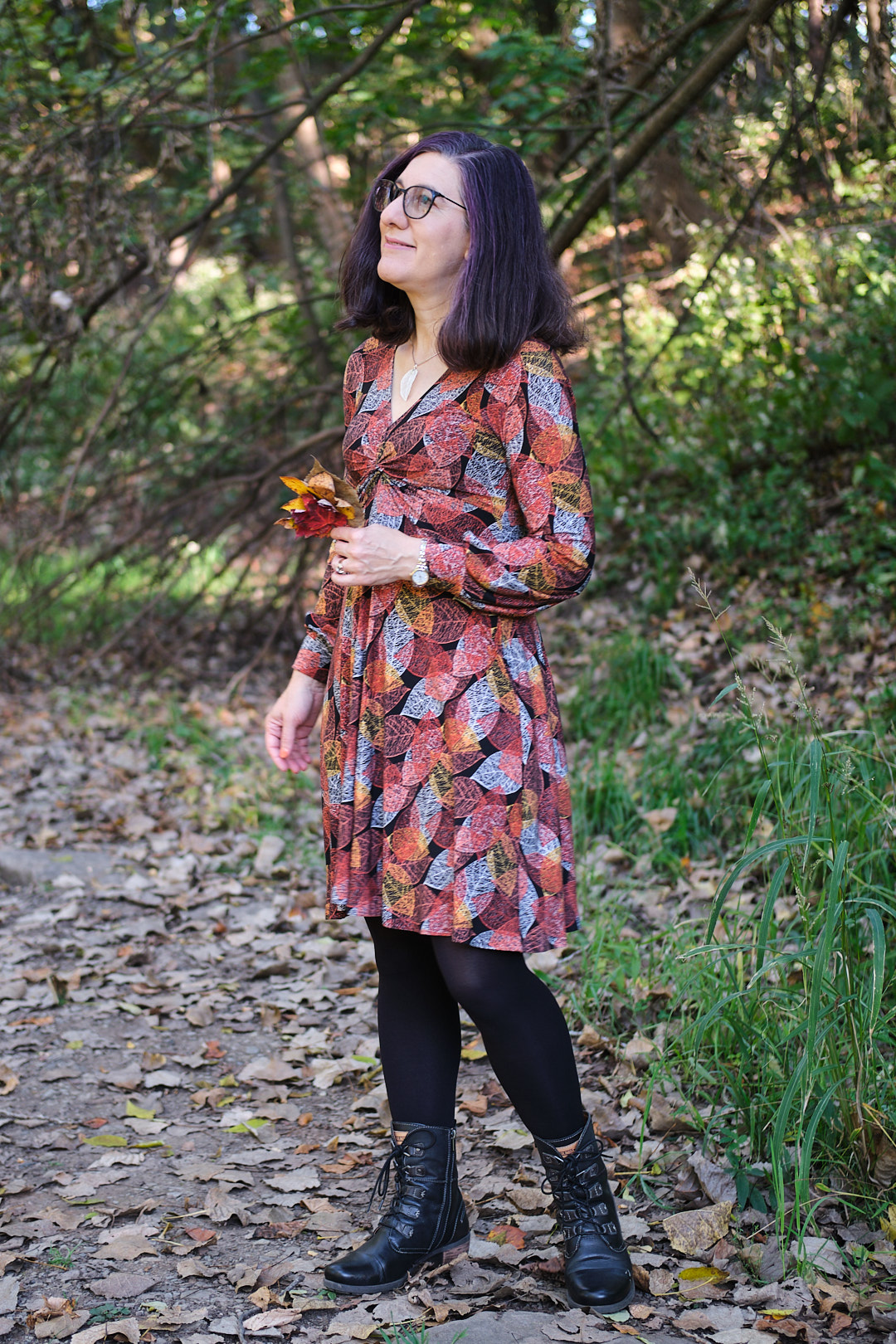The dress looks great with tights and ankle boots. I’ll probably wear it with a black tie-front sweater when it gets cooler. I accessorized with an inexpensive leaf pendant that matches the fabric perfectly.
