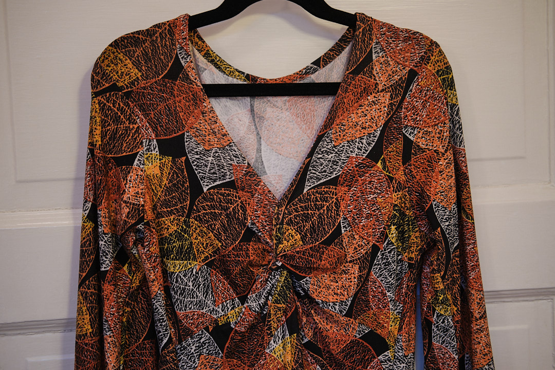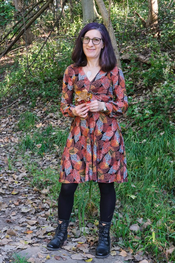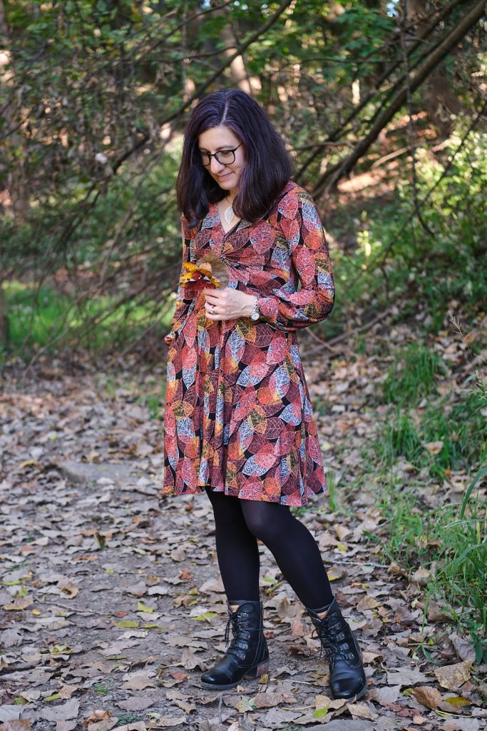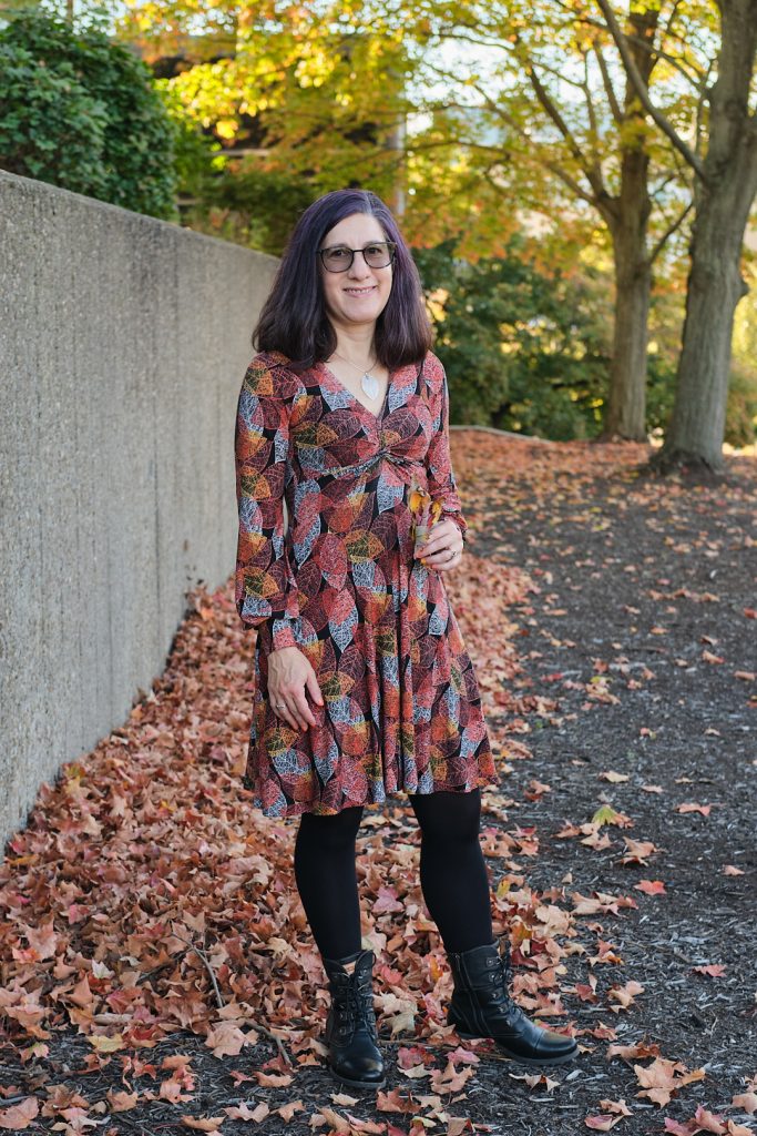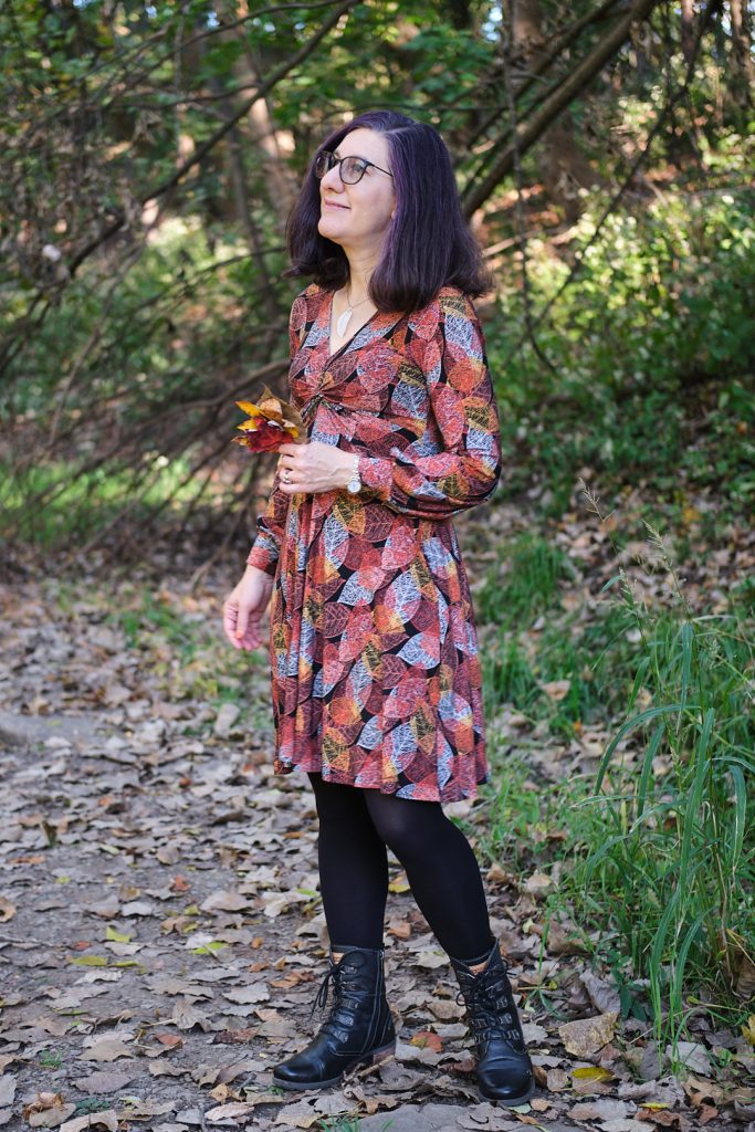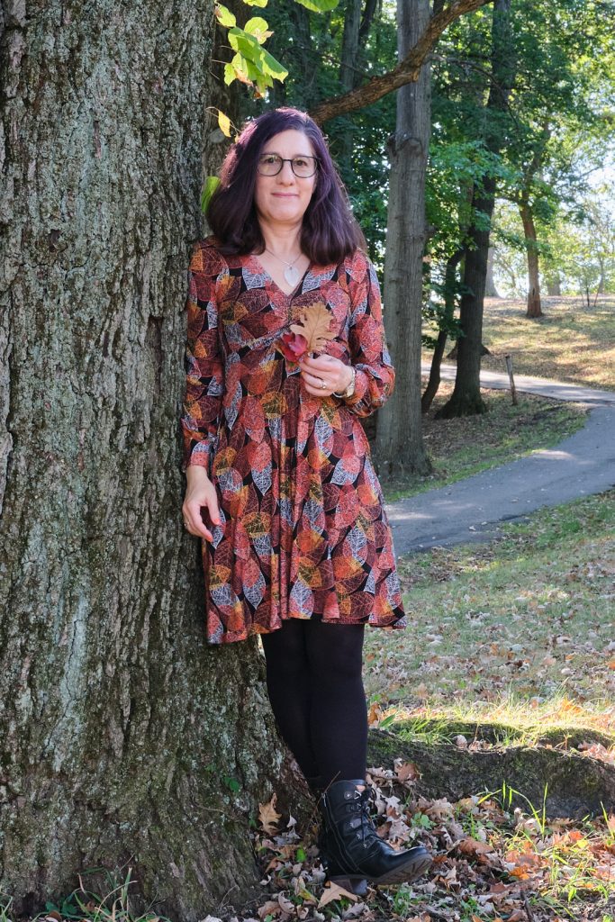 The dress looks great with tights and ankle boots. I’ll probably wear it with a black tie-front sweater when it gets cooler. I accessorized with an inexpensive leaf pendant that matches the fabric perfectly.