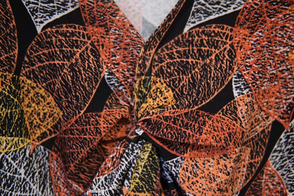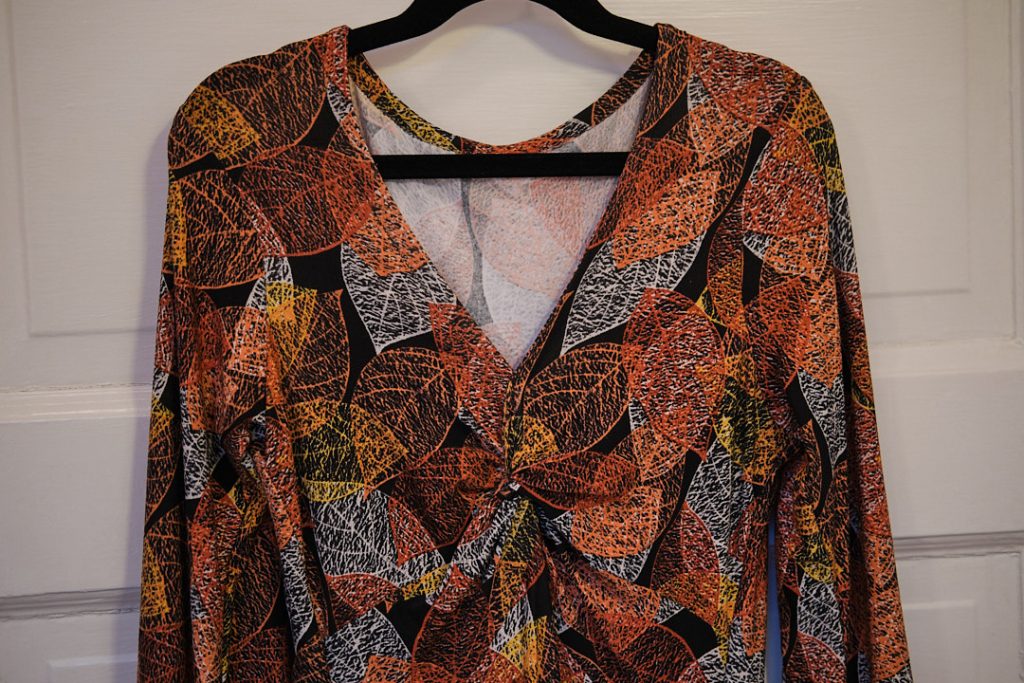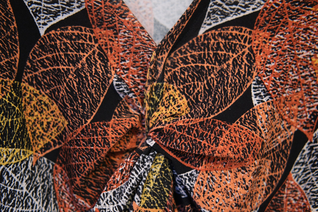 No, it didn’t snow in Pittsburgh. Actually, the weather has been delightful and more like Summer than Fall. Nonetheless, it’s starting to feel a little bit like Fall. In anticipation of more Fall weather coming this week, I made a Boo & Lu Blizzard dress from the most Fall-like fabric in my stash, a lightweight leaf-print ITY fabric. This cracked leaves fabric from Surge Fabrics is more light and drapey than a typical ITY, and appears to be slightly brushed on the front of the fabric and smooth and silky on the back. Unlike most other ITYs I’ve worked with, the edges on this one tend to roll a bit.
