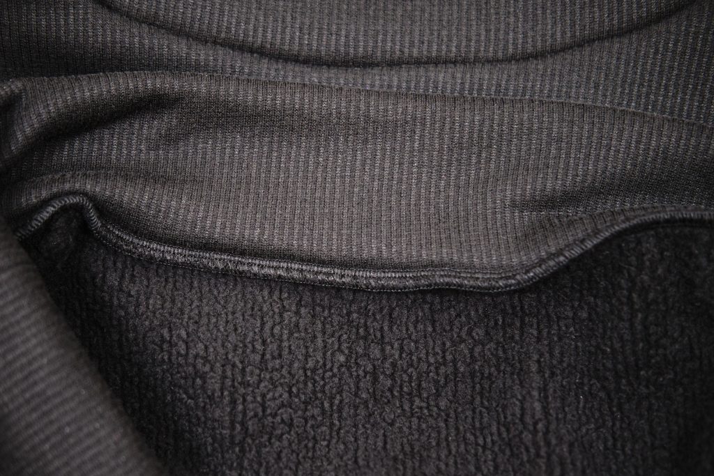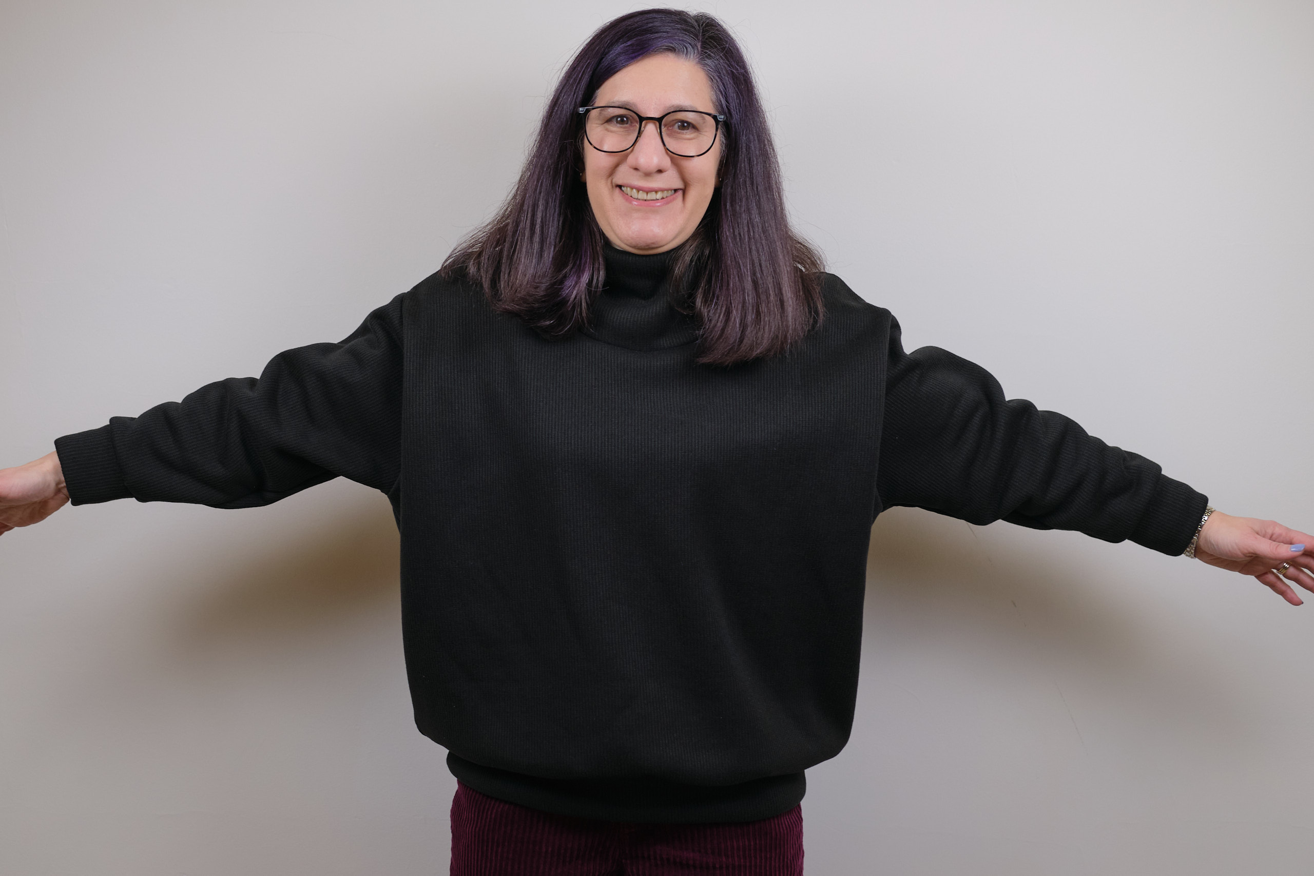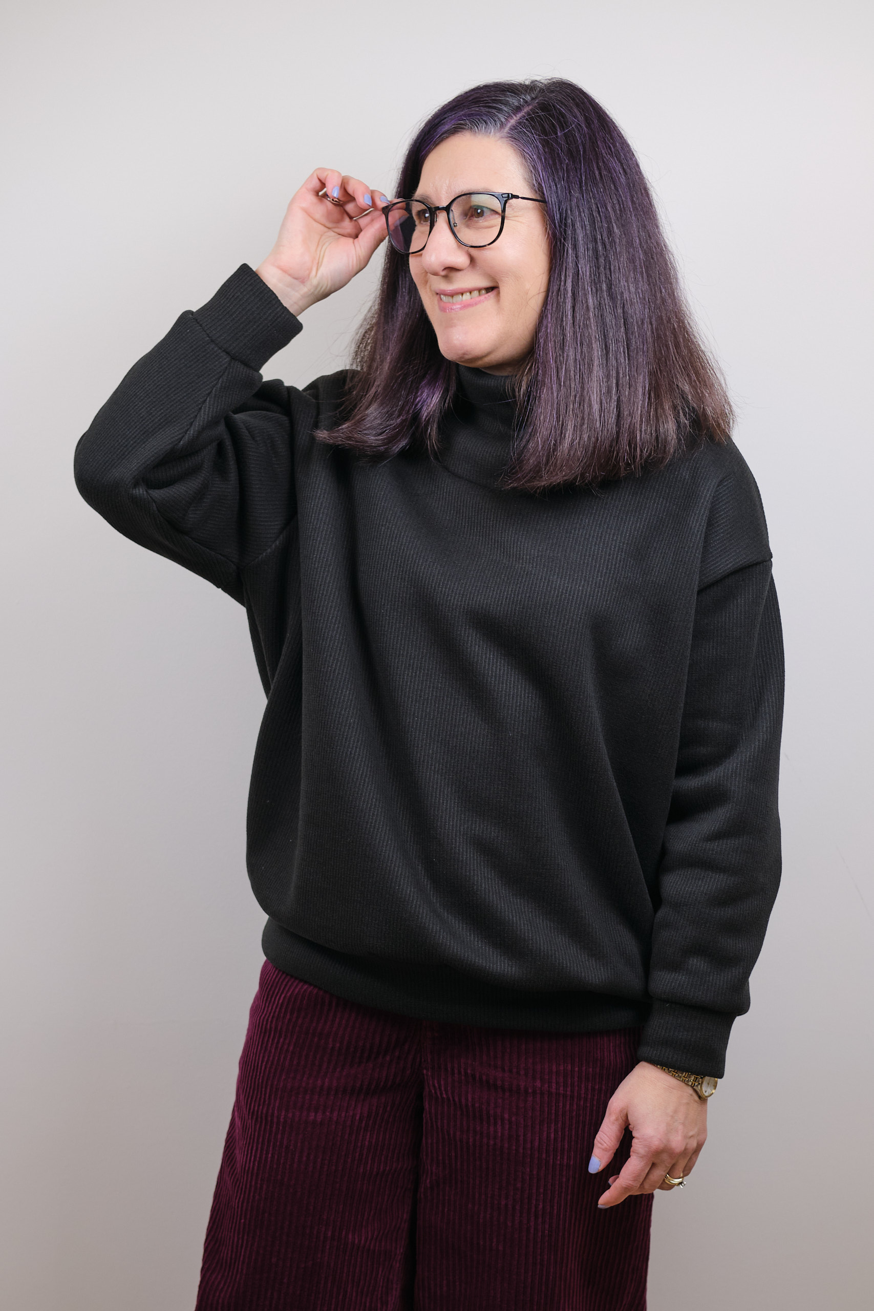 When Kayla Tarey hacked the Greenstyle Sav’s sweatshirt pattern into an oversized sweatshirt suitable for a heavy, low-stretch knit, I wanted to try it too. Kayla used Surge Fabric’s Polartec Wind Pro ribbed sweater fleece, which is 100% Polyester, 380gsm, with 25% horizontal and 0 vertical stretch. It has a 2×2 rib knit on the front side and soft sherpa fleece on the back. This seemed perfect for a cold-weather sweater. The folks at Greenstyle turned Kayla’s hack into the Surge Sweatshirt pattern, making it much easier for everyone to copy this style. The pattern works for a variety of knit fabrics, but because it doesn’t have a neck band and the bottom band and cuffs don’t require a lot of stretch, it works fine for heavy 2-way stretch fabric that doesn’t have a lot of stretch. I had 2 yards of black Wind Pro and decided to try it out.