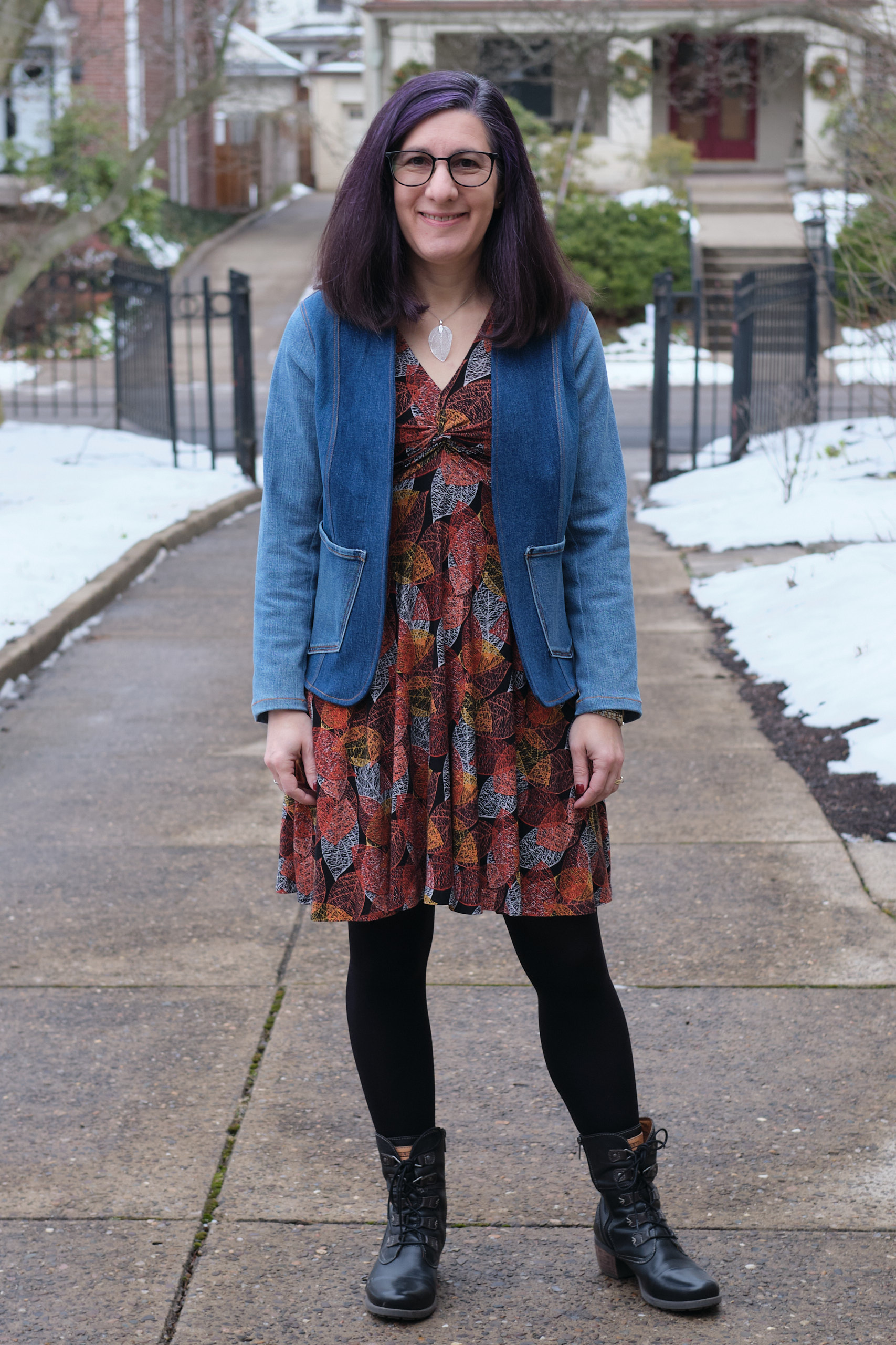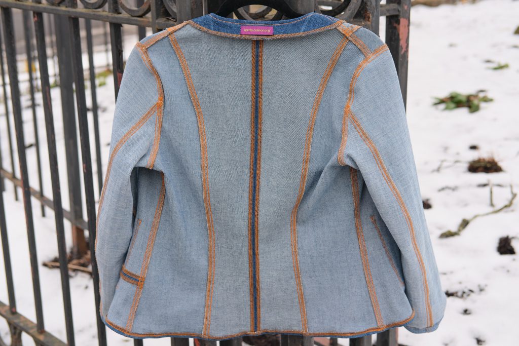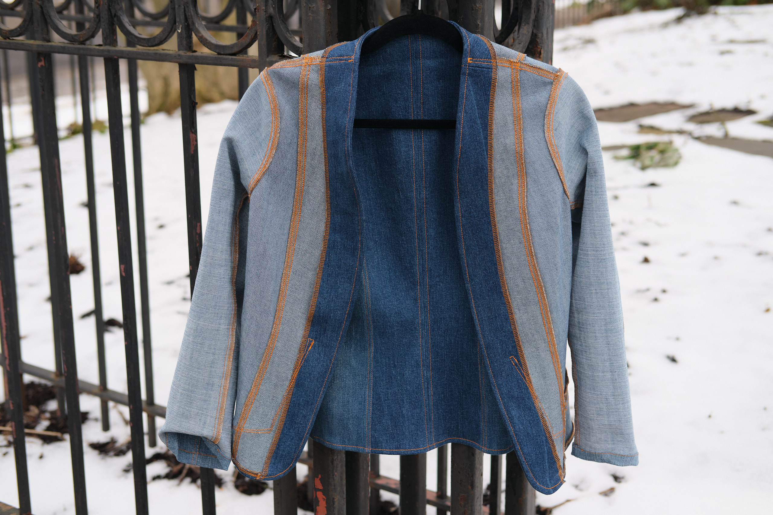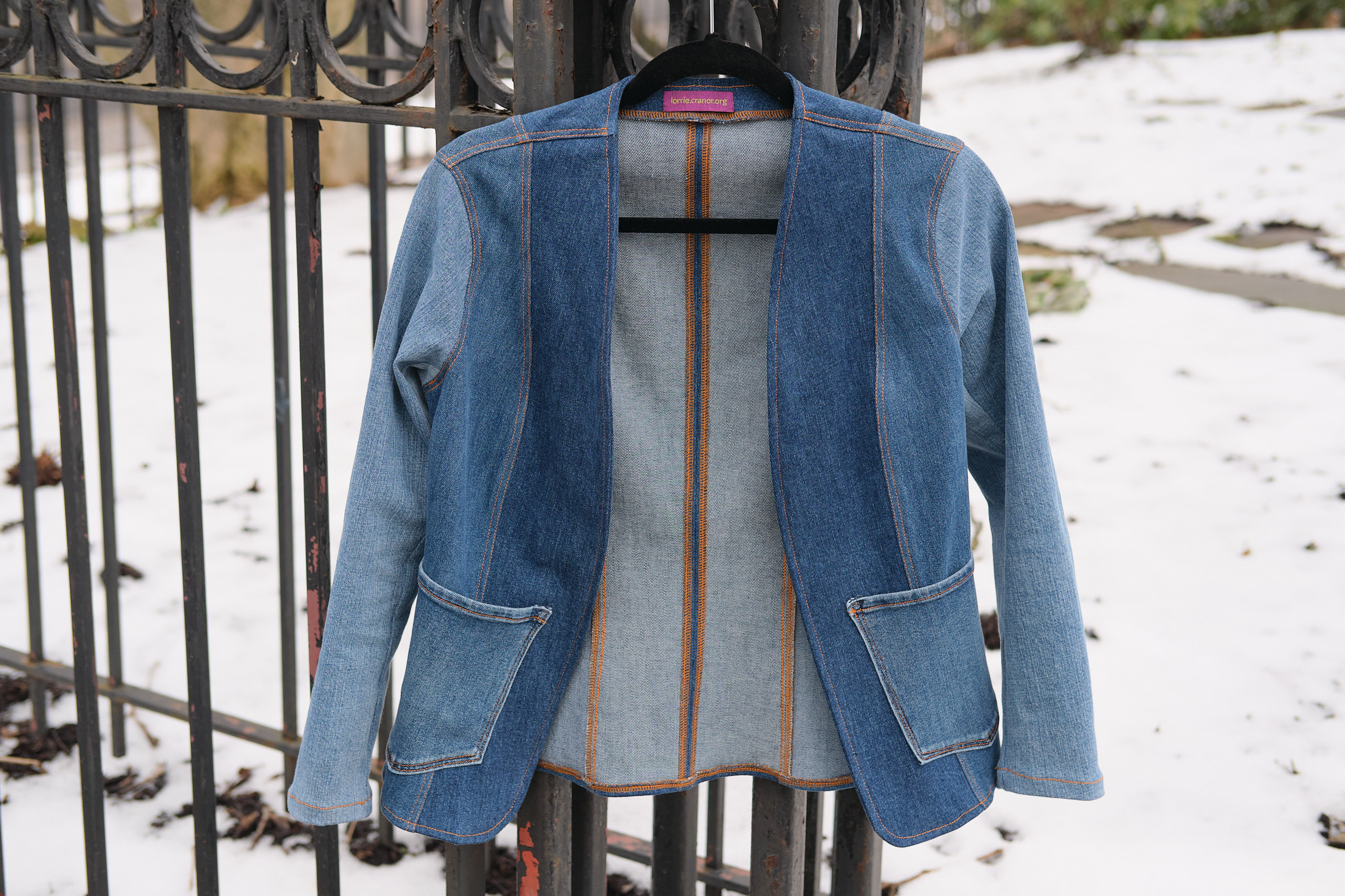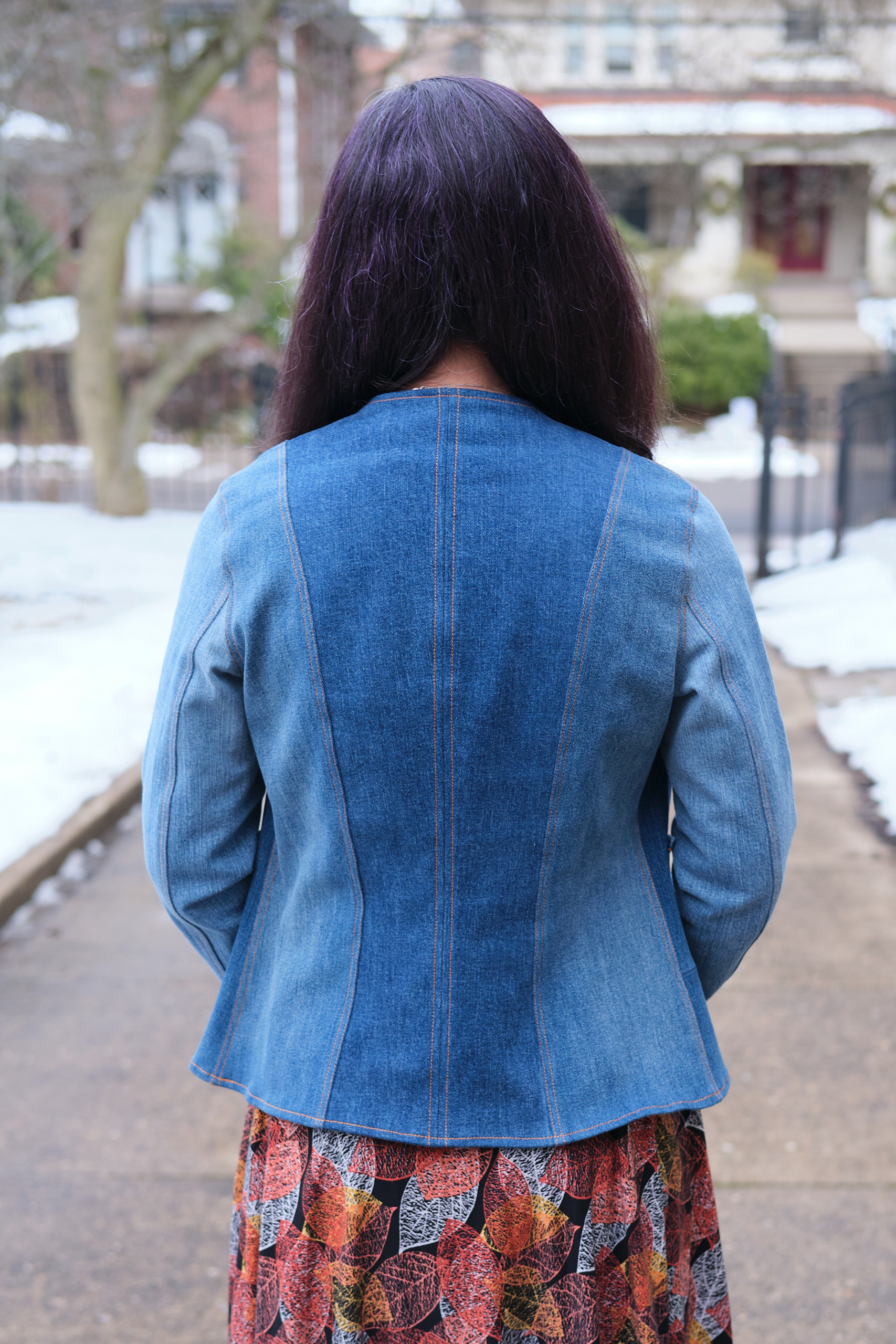 I used to love wearing denim jackets, which seem to go with just about everything, but I’ve found their collars increasingly uncomfortable. So the thought of a collarless denim jacket in a bit dressier blazer style was appealing. Unfortunately, I seem to have already given away most of the discarded jeans in my household and those that I could find were either full of holes and paint spots or ridiculously skinny and thus had very little fabric to work with.