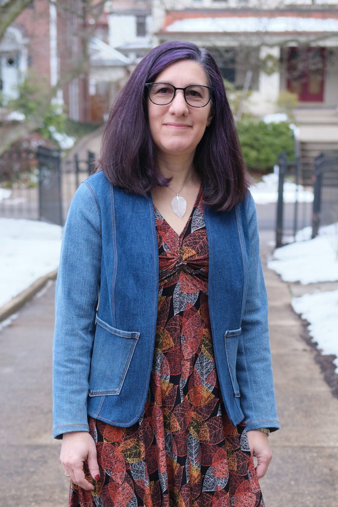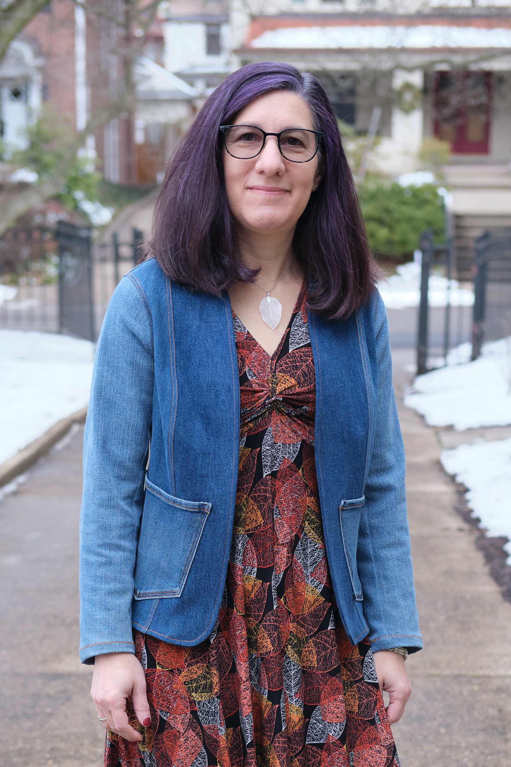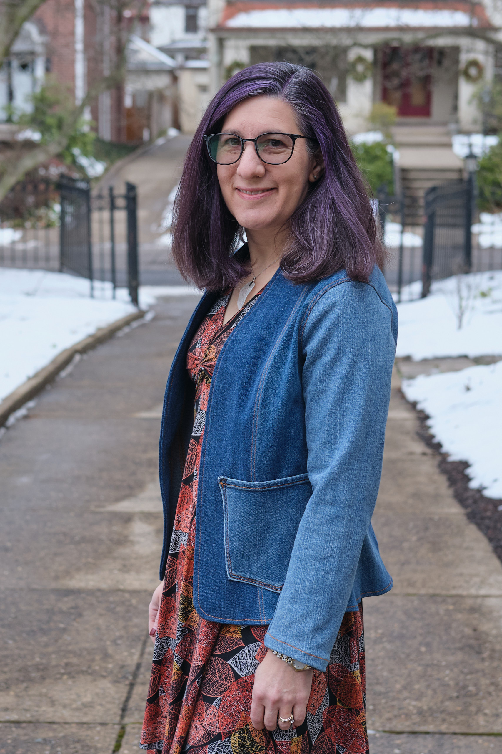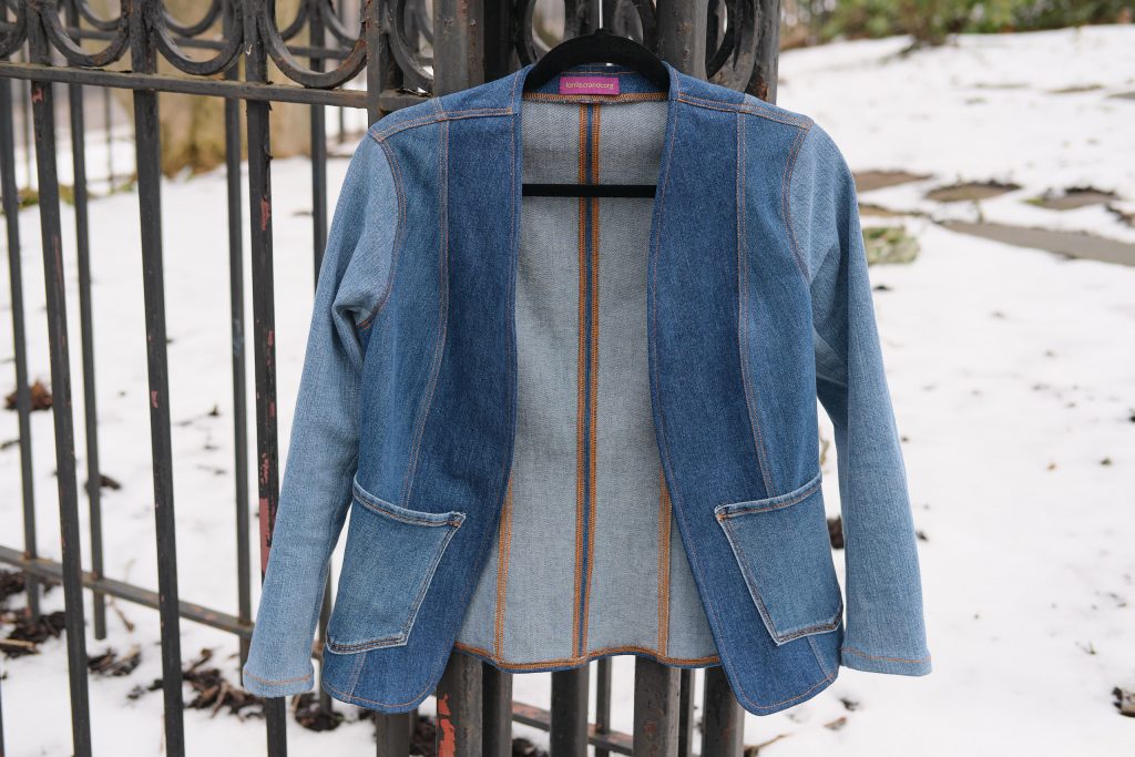 I made four Boo & Lu Onyx blazers in 2025, including a black ponte tulip style, a purple scuba suede cropped style, and grey ponte and magenta ponte hip length with pockets. The first one had some fit issues, the second one is better, and the last two fit me just about perfectly. I could have stopped there, but I couldn’t stop thinking about the fabulous upcycled denim Onyx made by Brenda Hennis Verbaan out of three pairs of old jeans.