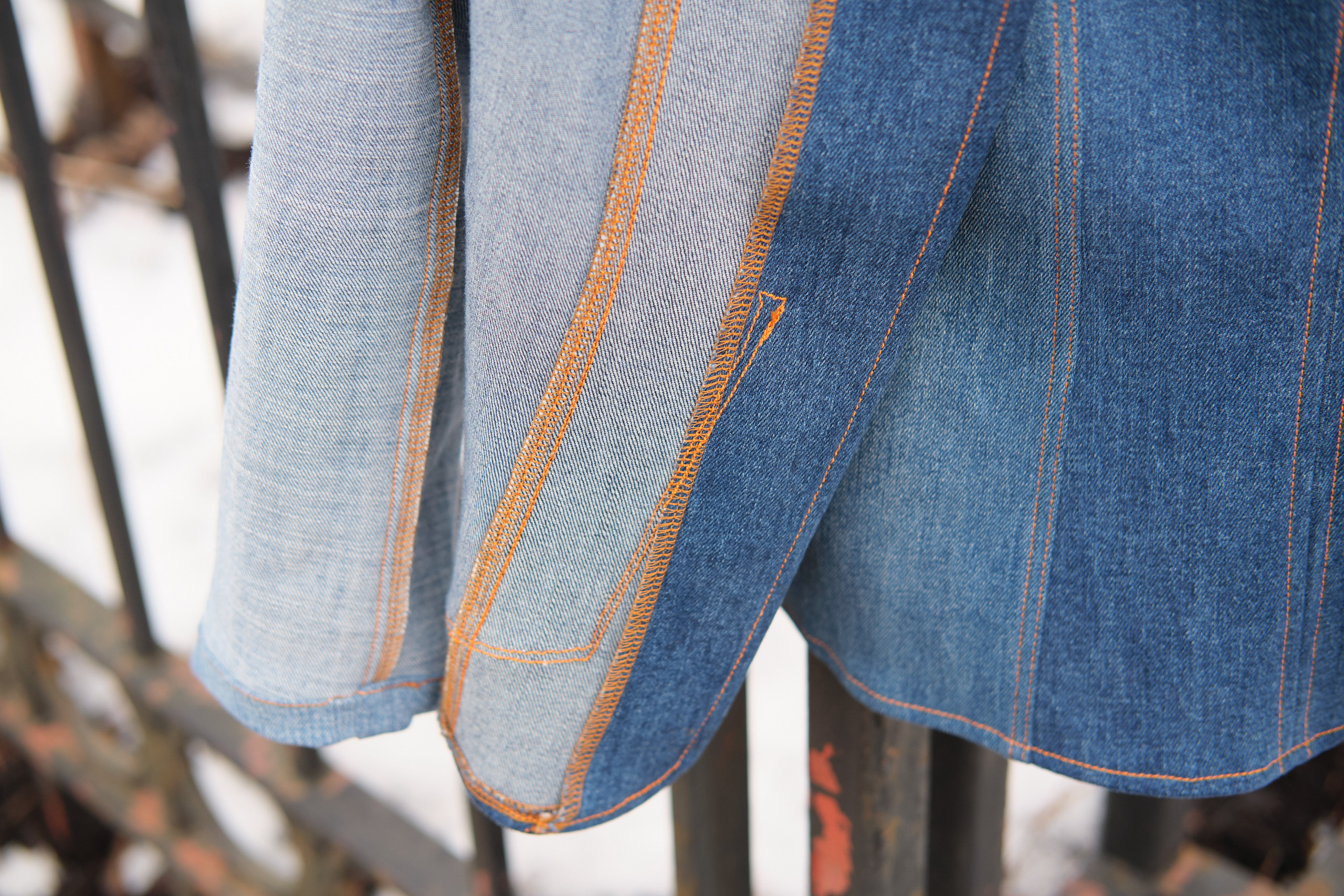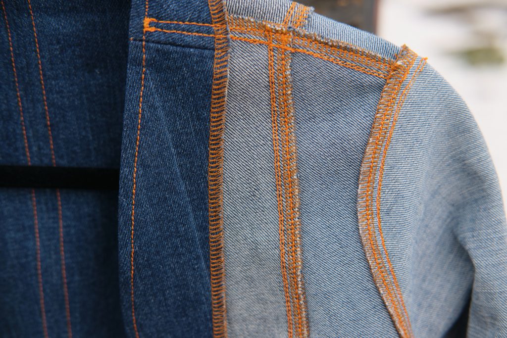 I also spent some time studying the stitching on different brands of jeans and denim jackets to see what color top stitching thread is used and where the top stitching is placed. I also read some blog posts on jeans anatomy. Some jeans match the top stitching to the denim color, others use a light yellow gold, and still others a more orangy gold. I’m sure there are other variations too. I observed that most jeans top stitching is done in two parallel lines, and generally as a chain stitch. Of course, it can’t be done everywhere because once you close both sides of a pant leg or sleeve, it is no longer possible to topstitch. Thus, one side is topstitched while the leg or sleeve is still open and the other side doesn’t get topstitched. I noticed that jackets don’t usually have topstitching on the side seams, but there is no practical reason not to do it so I decided to do it anyway.