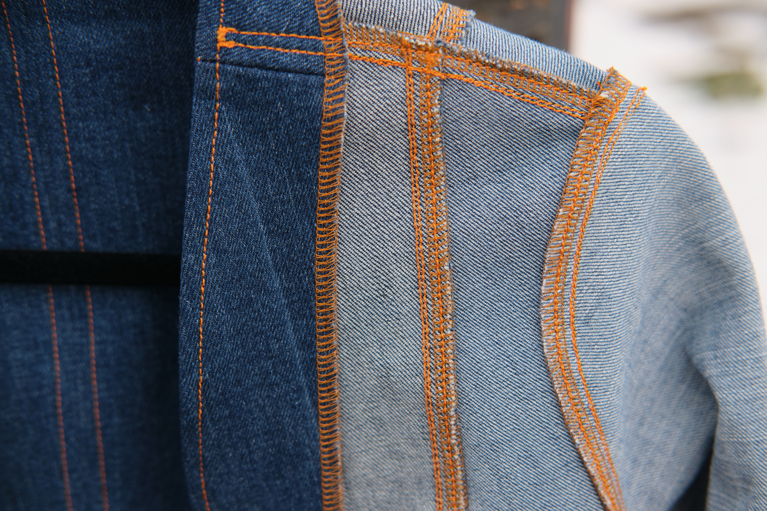 I threaded my sewing machine with 30 weight polyester topstitching thread in a golden orange color that I thought would nicely “pop” against the blue denim. After some tests on denim scraps, I decided I would use the topstitching thread for piecing as well so as to avoid lots of thread changes. I set a slightly longer-than-normal stitch length of 3. I did not opt for chain stitching as that would have required lots of resets on my serger. I found I could achieve the parallel topstitching lines by stitching very close to the seam with my edge foot with the needle shifted 3 clicks, and then a quarter inch over using my quarter-inch quilting guide foot. I threaded the serger with four spools of regular polyester overlocking thread in a similar color as the topstitching thread.