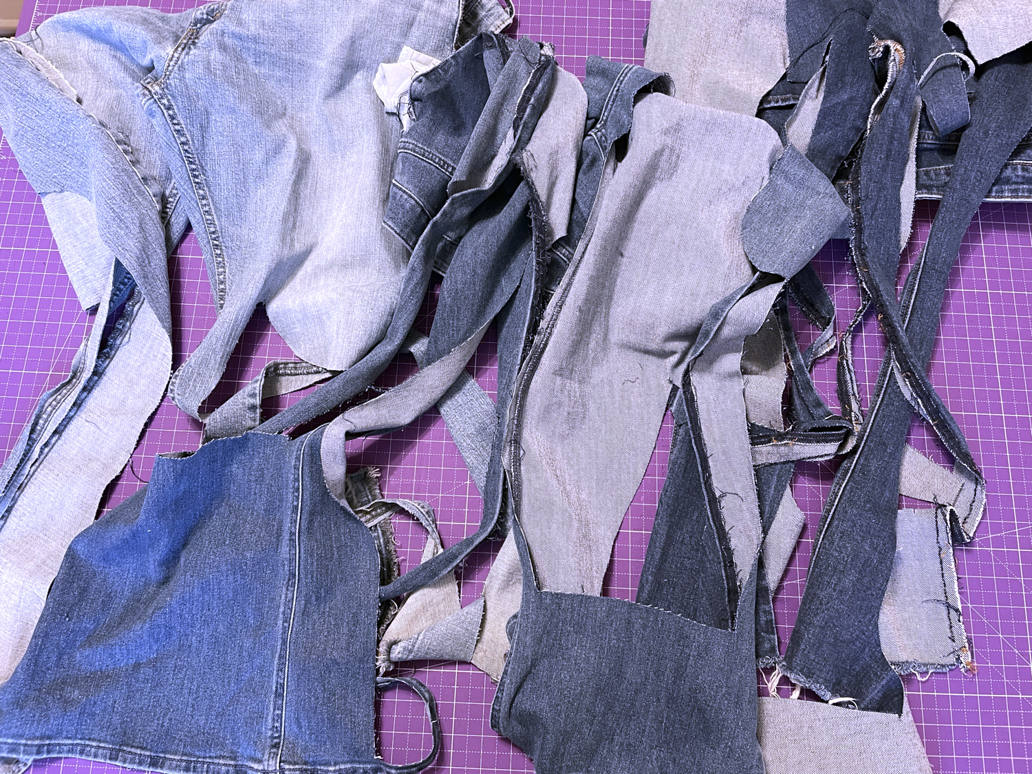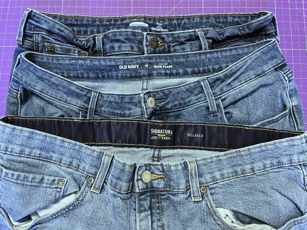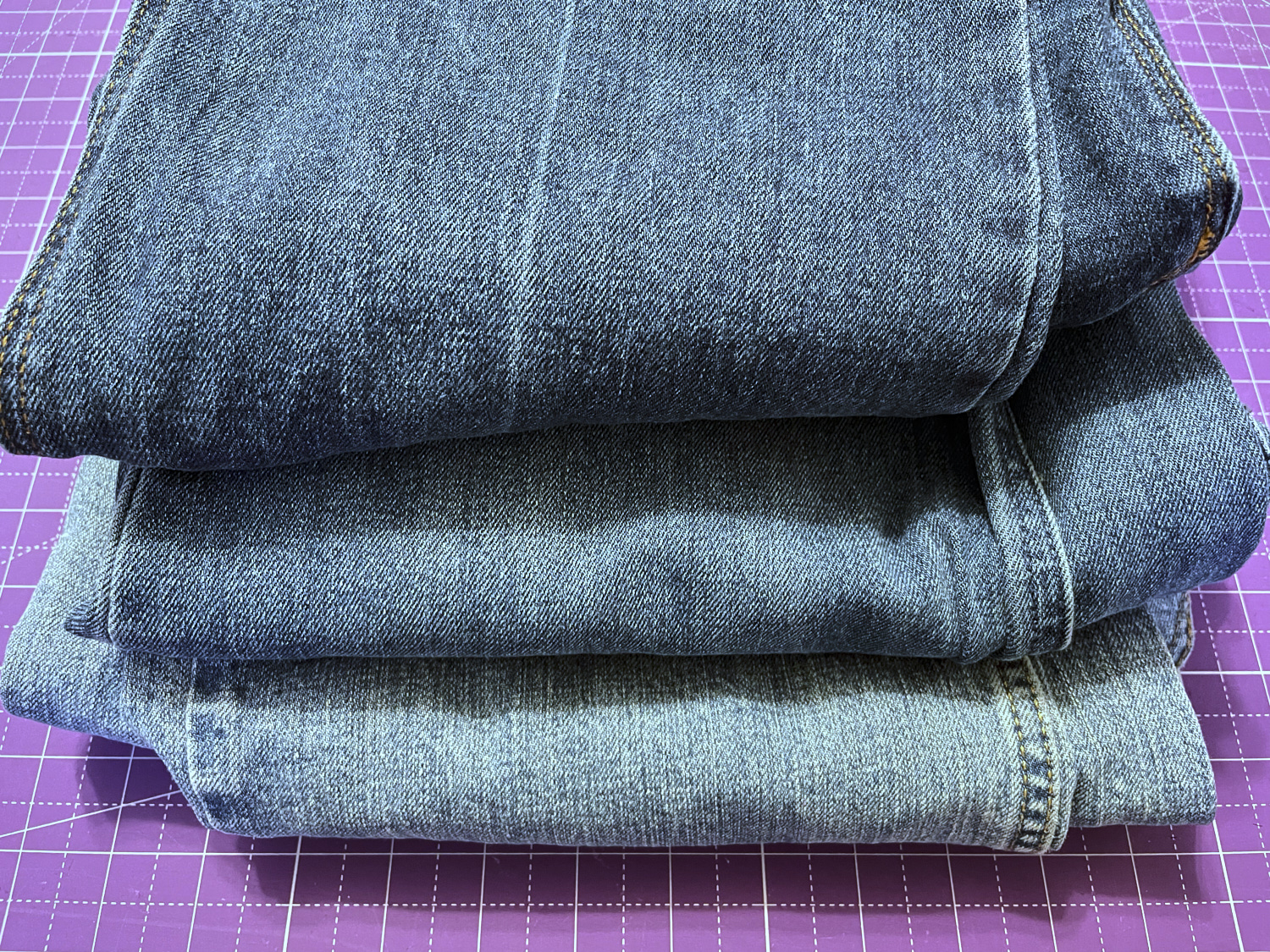 Last fall, when I was visiting my daughters in Boston, we went to a thrift shop and I asked them to help me find three pairs of inexpensive jeans I could cut up. I looked for jeans that were less than $10 a pair, medium-weight, slightly stretchy denim, in large sizes. I collected a pile of jeans that met these criteria and sorted them from lightest to darkest. Then I selected three pairs with distinctly different shades of blue that went well together. They were $6 each and with the $6 coupon I picked up on my way into the store, I paid a total of $12 for all three pairs.
