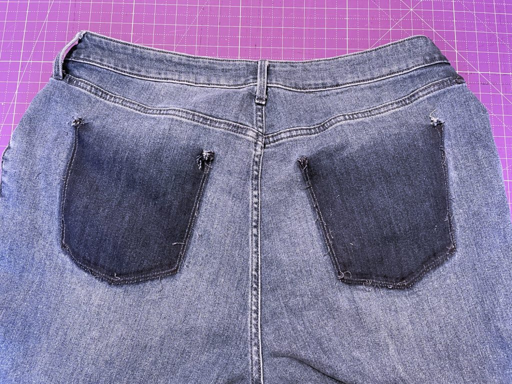 Rather than using the pocket design included in the pattern, I decided to use the rear pockets from one pair of jeans. I carefully unpicked them and removed all the top stitching. Unpicking pockets from jeans is mostly easy as they are attached with a chain stitch that easily unravels – except for the corners, which are thoroughly attached with a bartack and require some effort and a bit of elbow grease to remove. I ended up using most of the legs of all three pairs of jeans. There is still a little bit of leg fabric and seat fabric that might be used for other projects that can use smaller pieces.