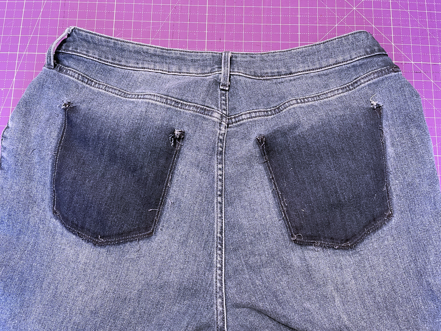 I carefully cut out all the pieces, making sure to pair pieces from the left and right legs of each pair, cut at approximately the same height on the leg. I accidentally cut one of the front side pieces too short and wasn’t going to be able to cut a piece of a similar color at the full size so I just cut the missing part and spliced them together. I knew most of this seam would be under a pocket and hardly noticeable.