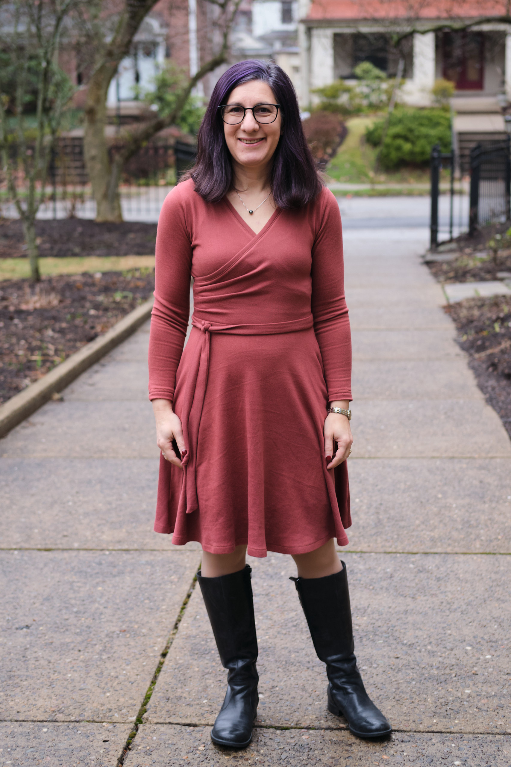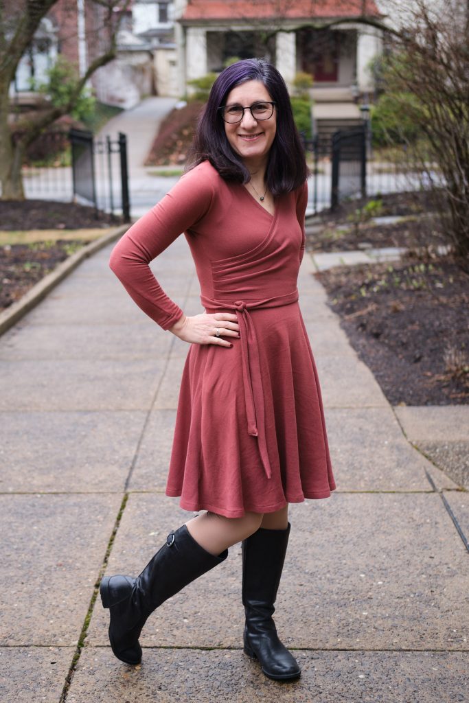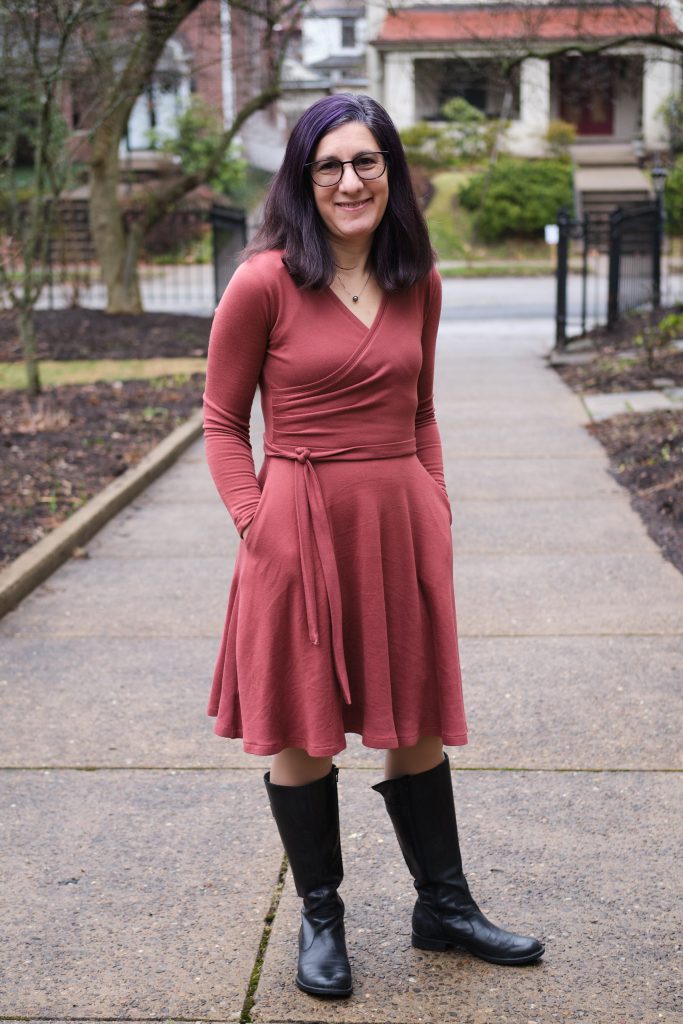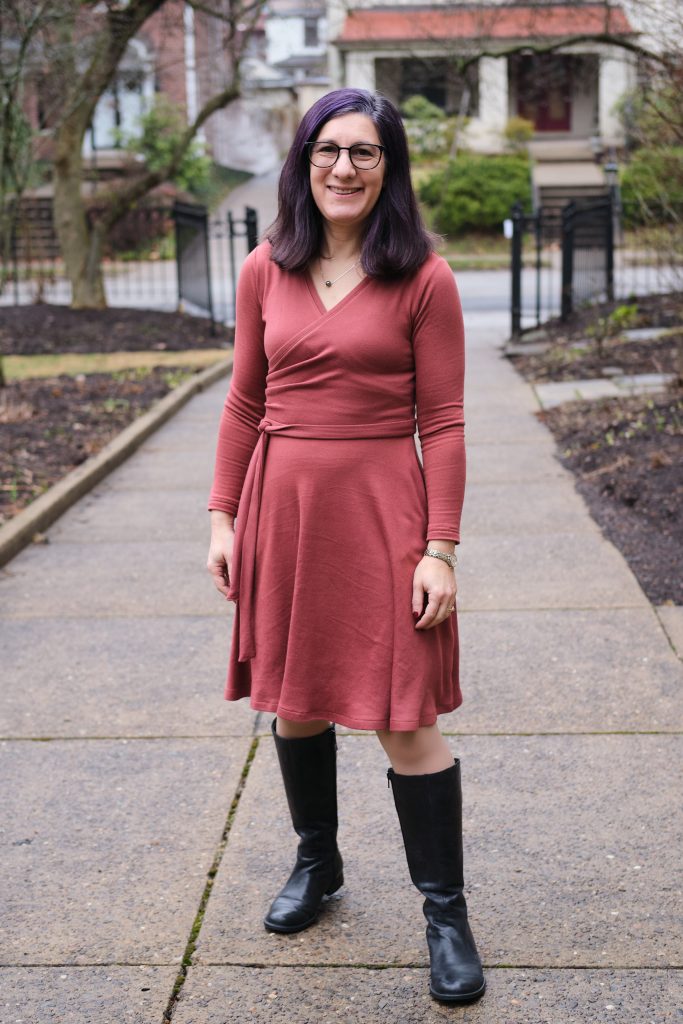 I saw an ad for a Merino wool wrap sweater dress in “terracotta” and was inspired to make my own, except in a faux wrap style (easier to deal with) and in a faux wool (easier to wash). And while I was at it, knee length (rather than midi length) and full length sleeves (rather than 3/4). I used two yards of Sienna Versailles brushed hacci, which I’ve used before for a Sweet Cheeks sweater. It is 5%Poly/5%Spandex, 200gsm, with 50% horizontal and vertical stretch. It is super cozy because it is brushed on the inside, which gives it a polished finish while being very comfortable to wear.