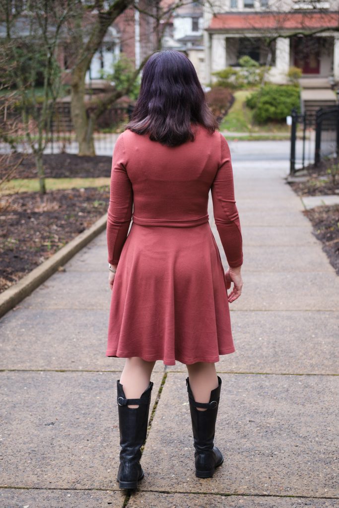 Everything seemed to go pretty well until I started constructing the pockets. After attaching and understitching the pocket bags, I realized that the the pocket bags were not going to lie completely flat. I’m not sure exactly why, but I’m guessing the ponte stretched a bit as I was sewing the curved pocket openings. I tried steaming and pressing but never did get it completely flat. This became a problem again when I attached the bodice to the skirt. I basted and re-basted multiple times until it was close to smooth, and finally sewed it together with my serger and pressed it again. It’s not quite as perfect as I would like, but now they I look more closely at the Facebook photos I realize most of these dresses have minor pocket issues. When I tried the dress on I also noticed that the back facing is quite visible on me — there aren’t enough back photos on the website or Facebook group for me to see whether this is a common problem or not. I think this would be less noticeable with a print fabric or a lighter weight fabric, and perhaps I should have lined it with a lighter fabric rather than the ponte.